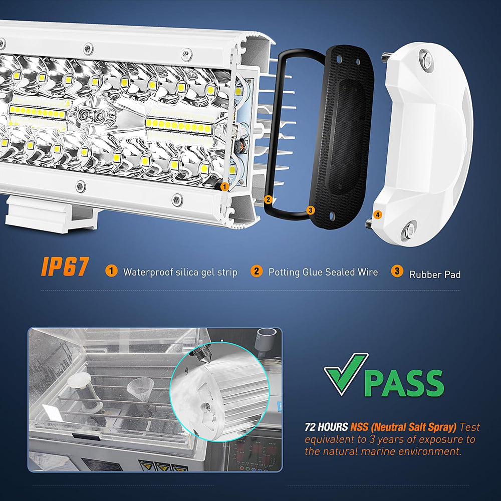 • Durable & Waterproof: With solid-build aluminum housing (durable powder coated) and stainless steel mounting bracket and hardware, anti-corrosive, dust-proof, quakeproof, providing great sailing and driving experience. IP67 waterproof, PASS 72-hour laboratory salt spray test, ensures excellent performance even in extreme weather condition like heavy rain, snow, hail, storm, etc