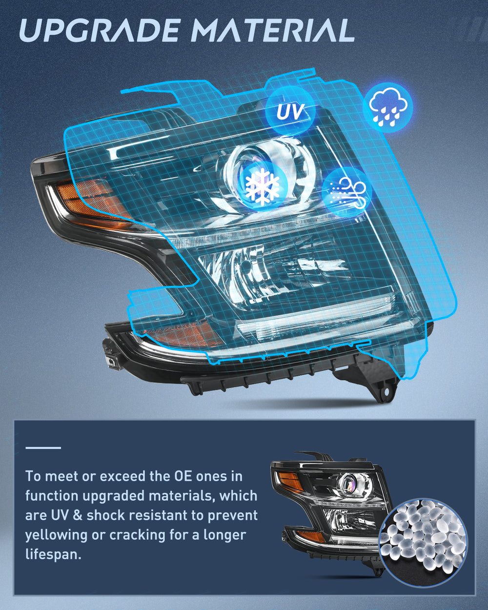 Compatibility: The headlight assemblies are compatible with 2015-2020 Chevy Suburban Models Only; 2015-2020 Chevy Tahoe Models Only; 2016-2019 Chevrolet Suburban 3500HD (Fit models with Halogen Headlights only).