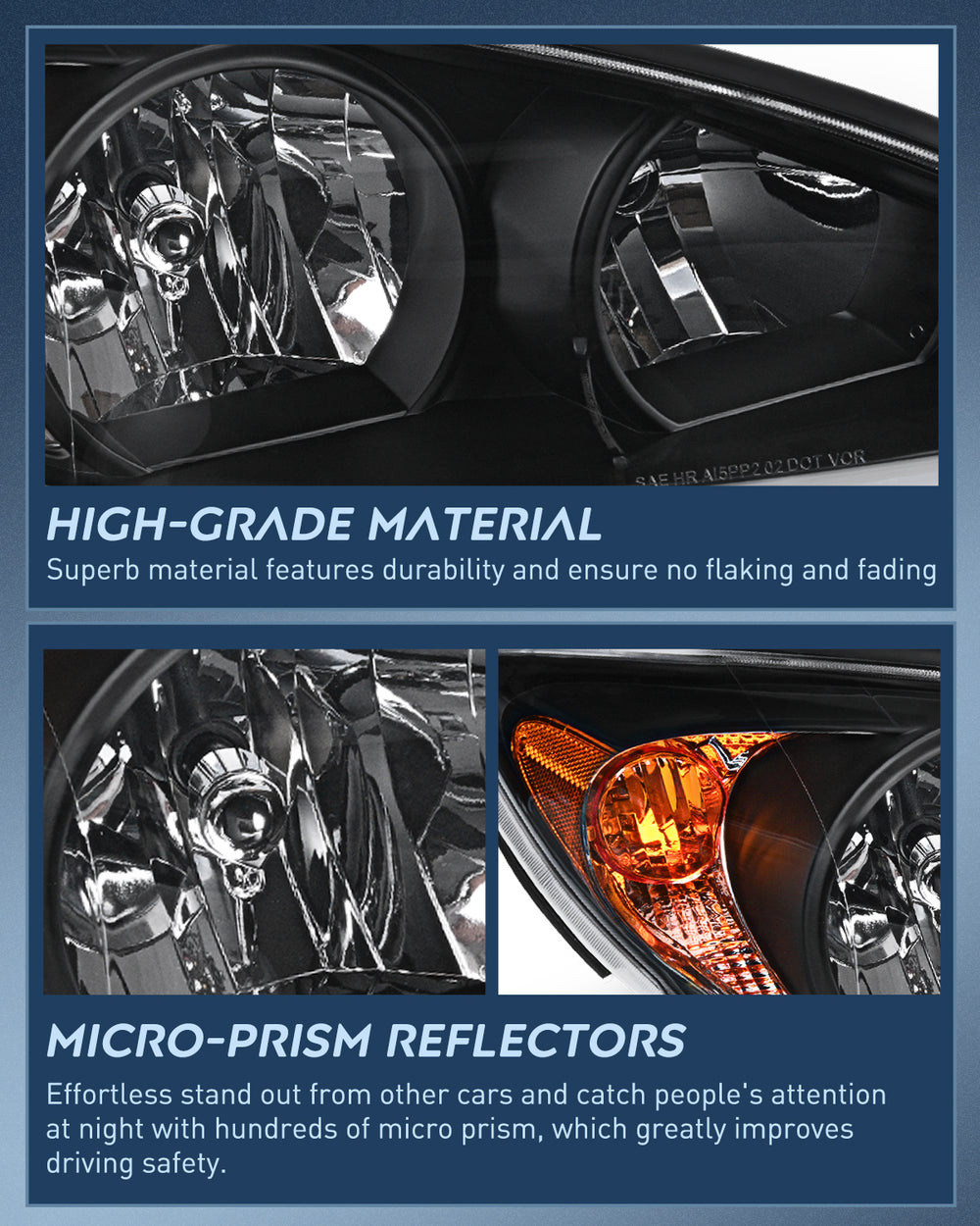 To meet or exceed the OE ones in function upgraded materials, which are UV & shock-resistant to prevent yellowing or cracking for a longer lifespan