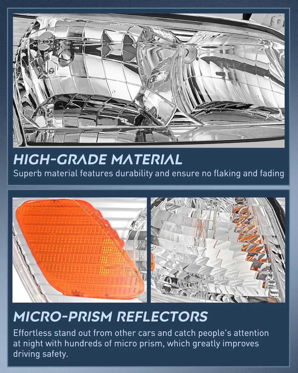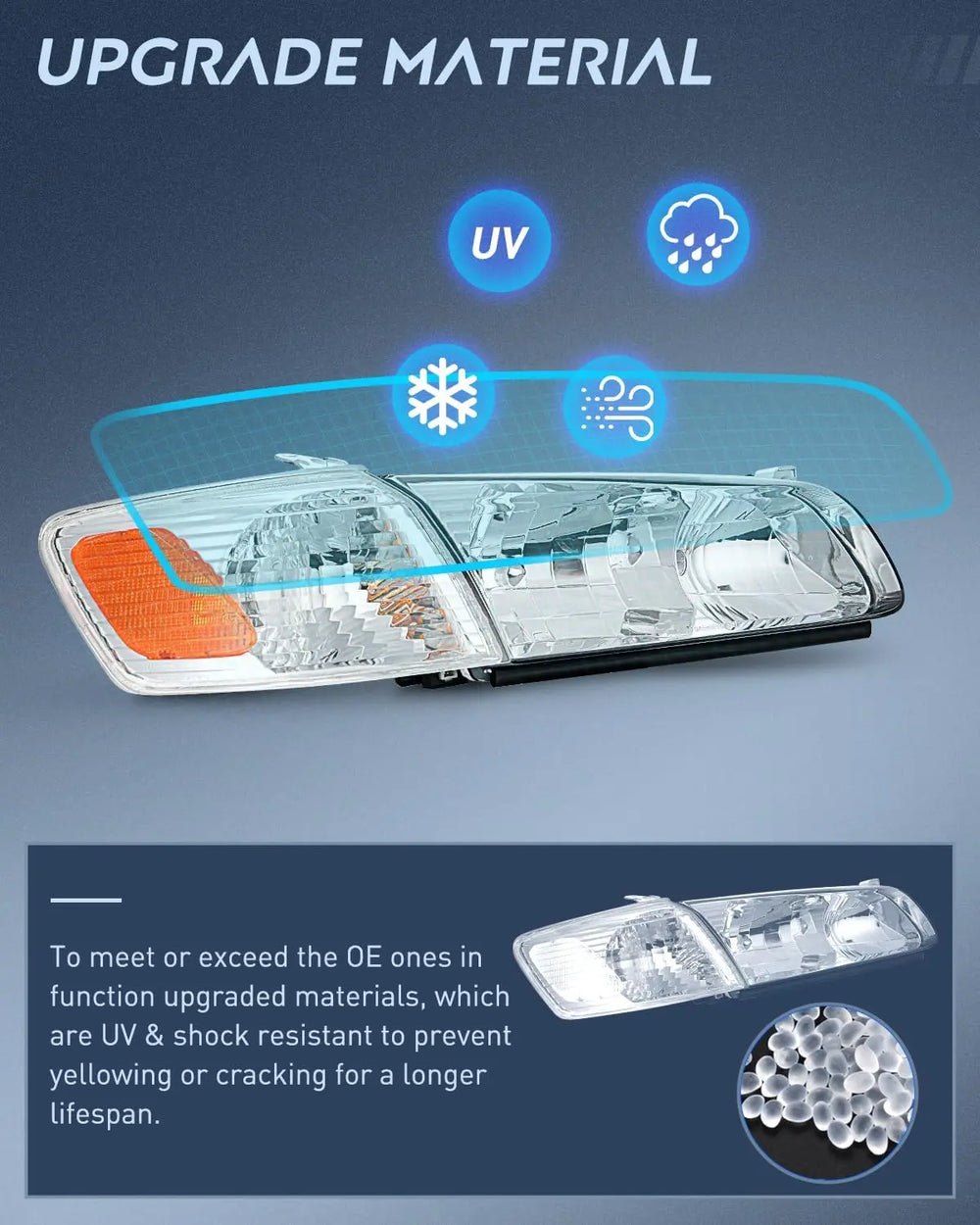 To meet or exceed the OE ones in function upgraded materials, which are UV & shock-resistant to prevent yellowing or cracking for a longer lifespan