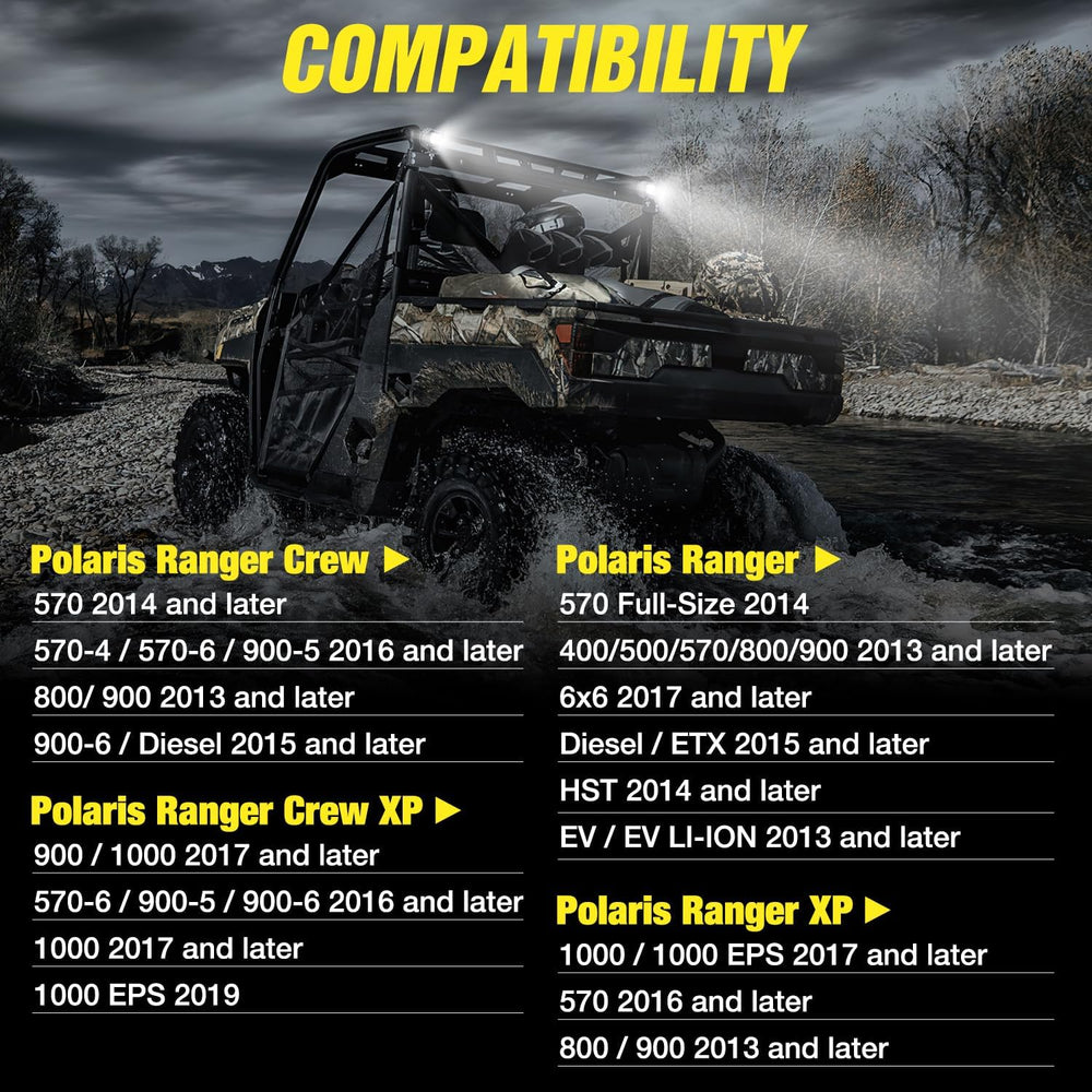 - The Brackets are compatible with 2013 2014 2015 2016 2017 2018 2019 2020 2021 2022 2023 2024 Polaris Ranger full-size body; and Ranger 570 / 800 / 900 / 900 XP / 1000 / XP 1000 / Crew XP 1000 (for more specific vehicle models, please refer to the details page)