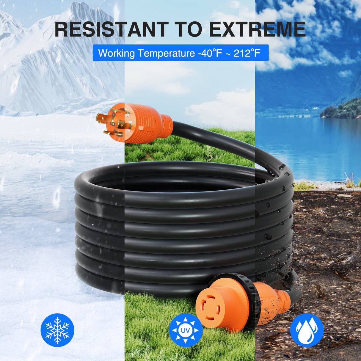 • 30 AMP Generator Cord Cord: Constructed with 100% pure copper with full 10 gauge wires ensuring high conductivity. Any time you run a 30-Amp extension cord, you create a voltage drop, which might cause problems with things like air conditioners. Our high-quality, low-gauge extension cord will minimize this. The cord is coated with a heavy-duty flame retardant, heat resilient PVC sheath that serves as protection from the outdoor elements, wear and tear.