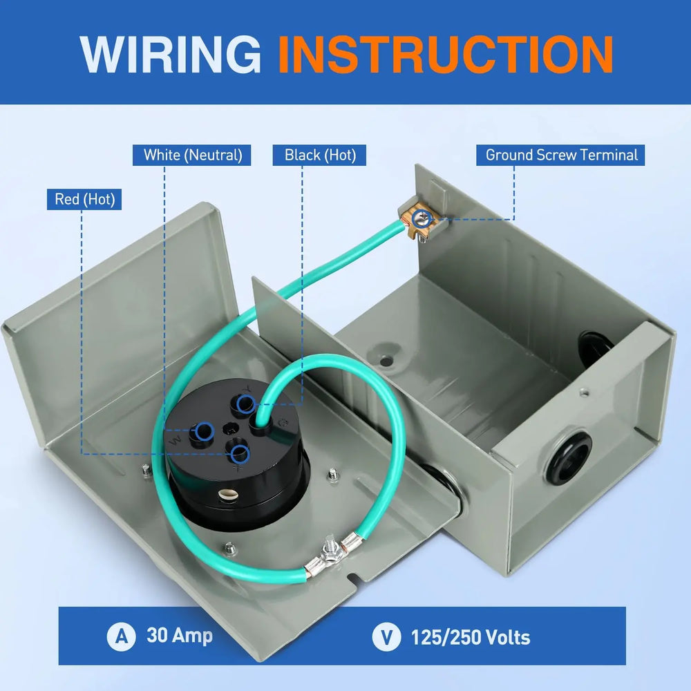 - 30 AMP Generator Power Inlet Box: NEMA L14-30P. Rated for 30AMP 125/250V. 30Amp generator inlet box with 4 prong L14-30P inlet plug, suitable for all 30 amp NEMA L14-30 generator cord. This 30A power inlet box is a good partner for the generator to accommodate the power cord. It is designed to be installed in outdoor areas where generators are used outdoors, and also be ideal for backup power during power outages/bad weather, etc.