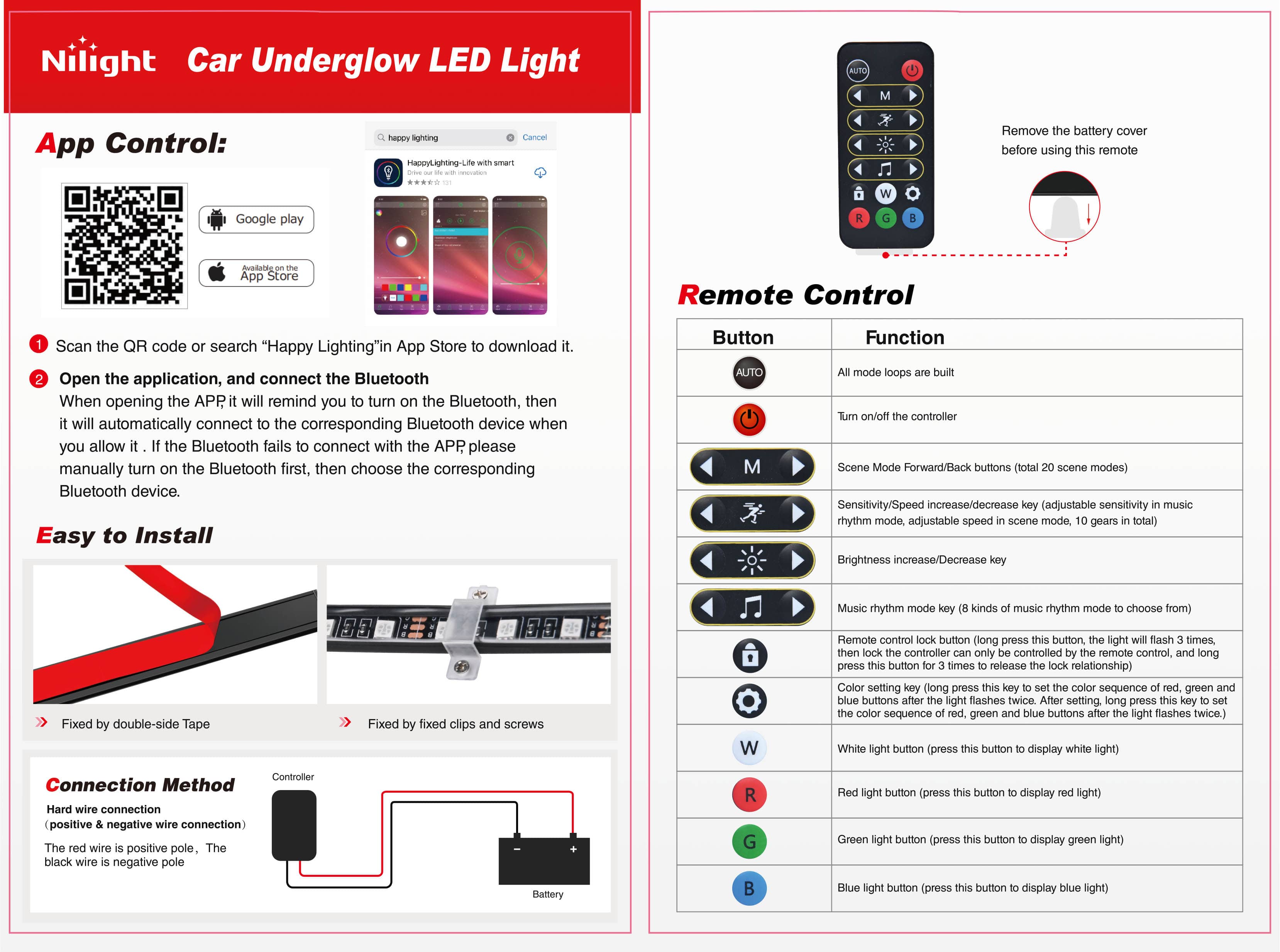 - Package Includes: 4PCS LED light strips, Remote Controller, Control Box, Mounting Hardware (screws, clips and zip ties).