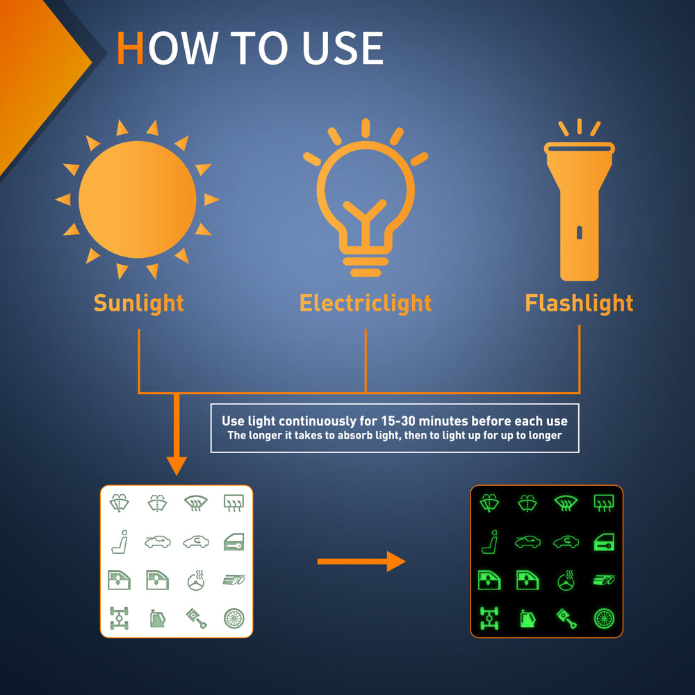 - Improve Safety: When driving at night, the car is dark, it is inconvenient to find buttons or press the wrong button, which leads to inattention and unsafe driving. This fluorescent sticker allows you to identify different buttons at a glance in a dark environment, which greatly guarantees the safety of night travel.