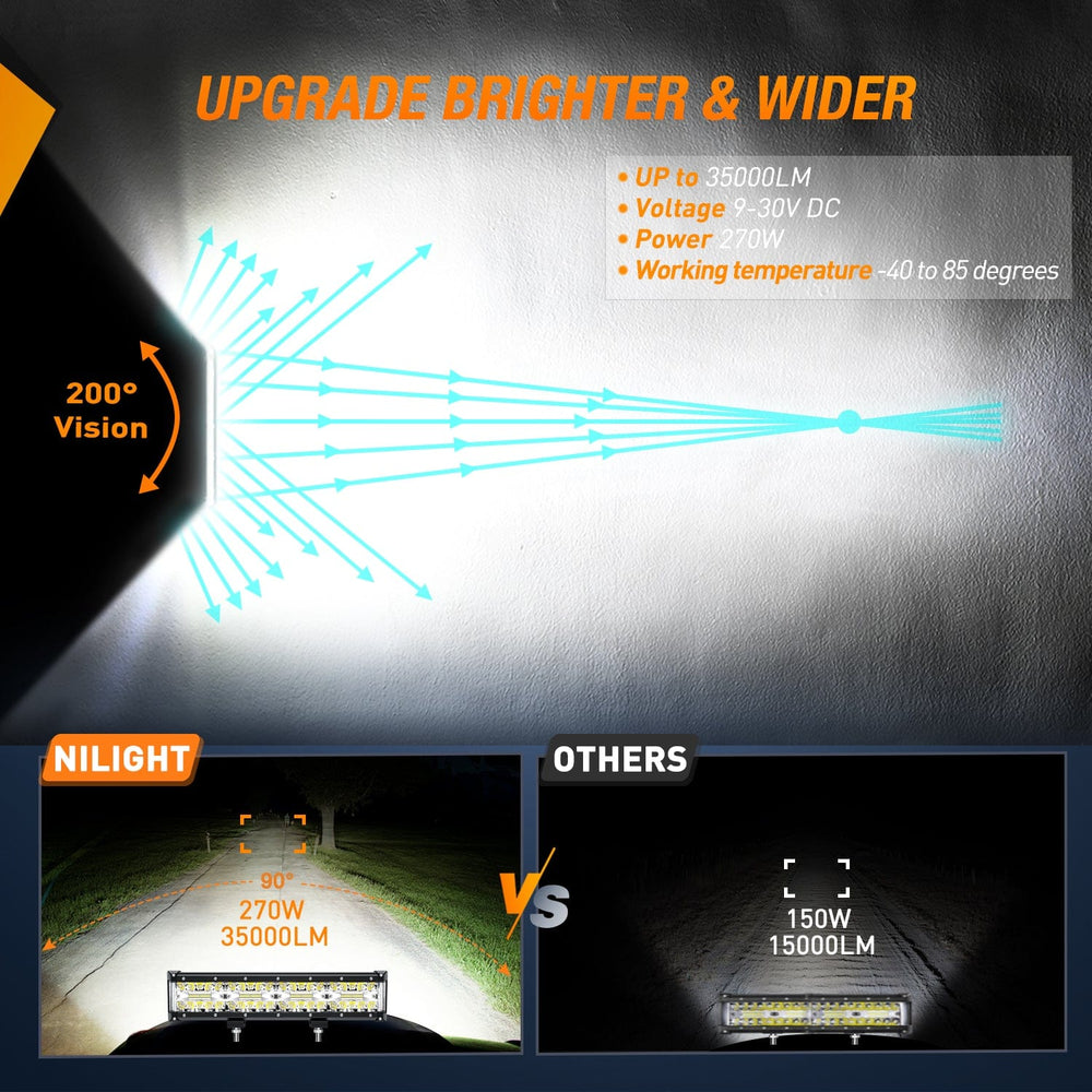 • Upgrade Side Shooter Design: Designed with side lights at two ends, triple rows of dual sided lights and nested reflector cup design combined beam, 170¡ã flood beam and 30¡ã spot beam, shoots out a 200¡ã wider and further light coverage to clear darkness and potential hazard, increasing your driving safety. Works great as fog lights, side lights, driving lights, etc