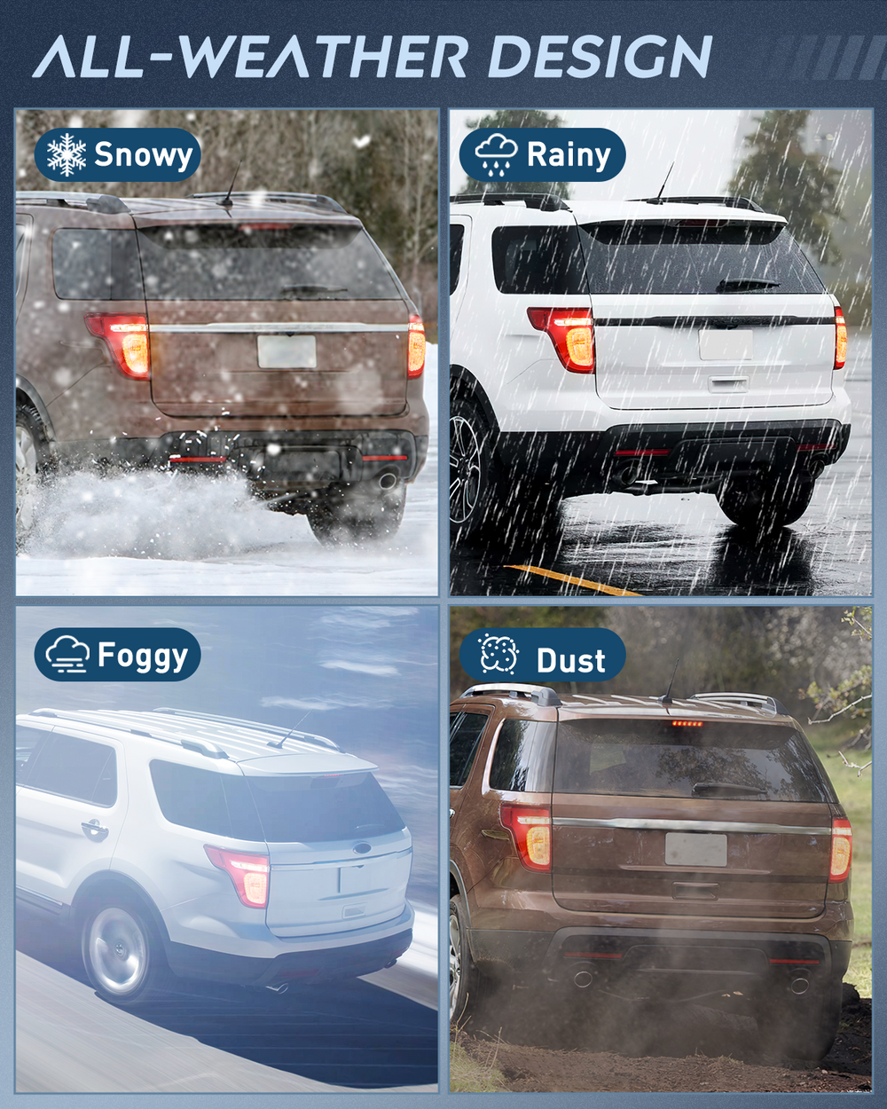 - Durability: The high-impact housing withstands shock and vibration. With fully sealed silicon prevents environmental damages including freezing, foggy, fading, corrosion, and provides reliable service in sorts of weather conditions such as rain, snow, or dust storms, enabling your car looks better and drive safer.
