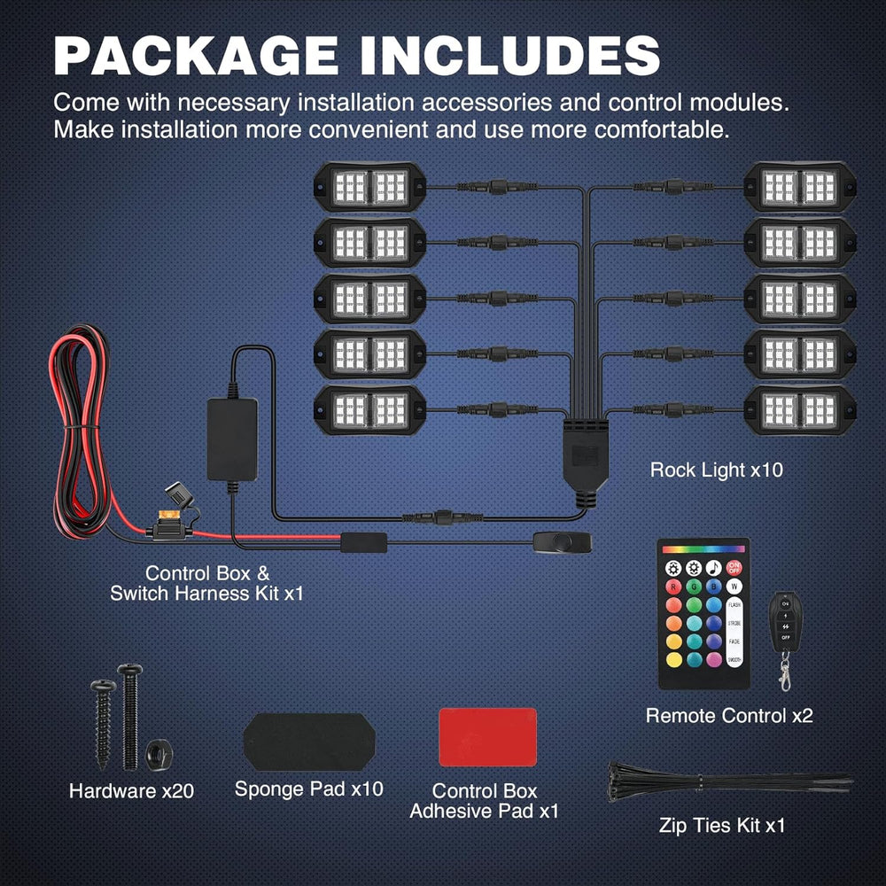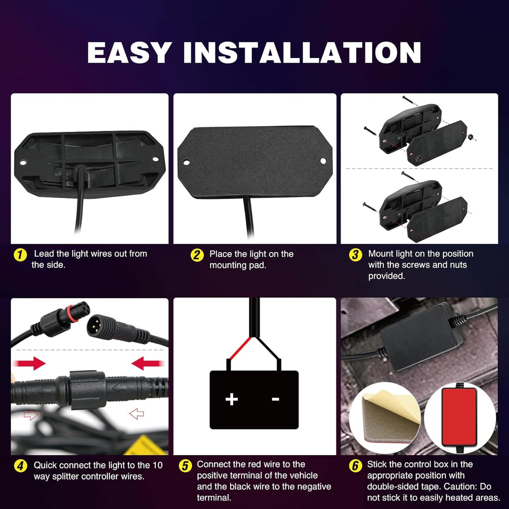 Offers millions of different colors with brightness adjustment. The RGB rock light come with 12 pcs bright and durable 5050 LEDs, freely choose and set the colors through the remote or bluetooth APP.