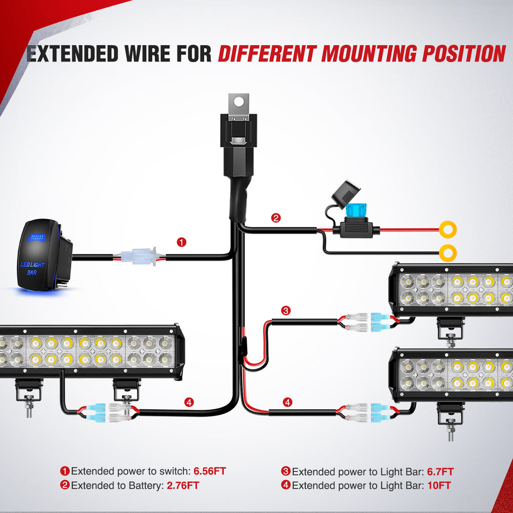 - Package Includes: 1 x wiring harness kit, 1 x 5 pin LED rocker switch, 1 x instructions, blade fuses and spade connectors.