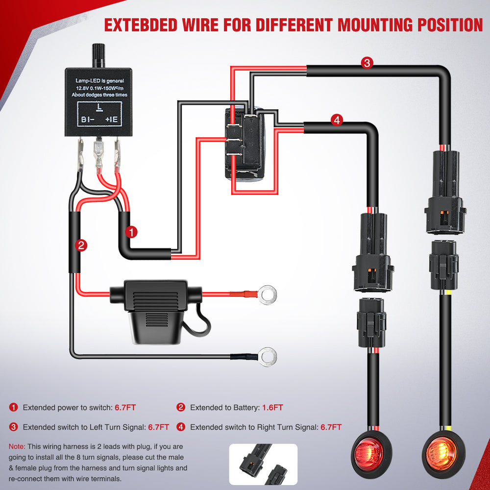 - Easy To Install: This turn signal kit is plug-and-play and easy to install, all the accessories and components are pre-assembled. You just need to plug them into the corresponding interfaces and connect the vehicle 12V power supply to work. Note: This wiring harness is 2 leads with plug, if you are going to install all the 8 turn signals, please cut the male&female plug from the harness and turn signal lights and re-connect them with wire terminals.