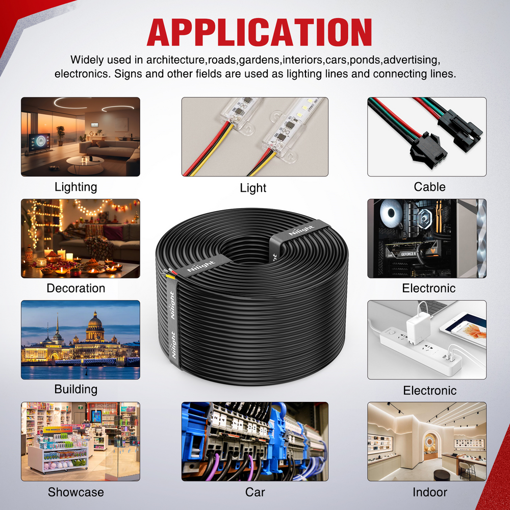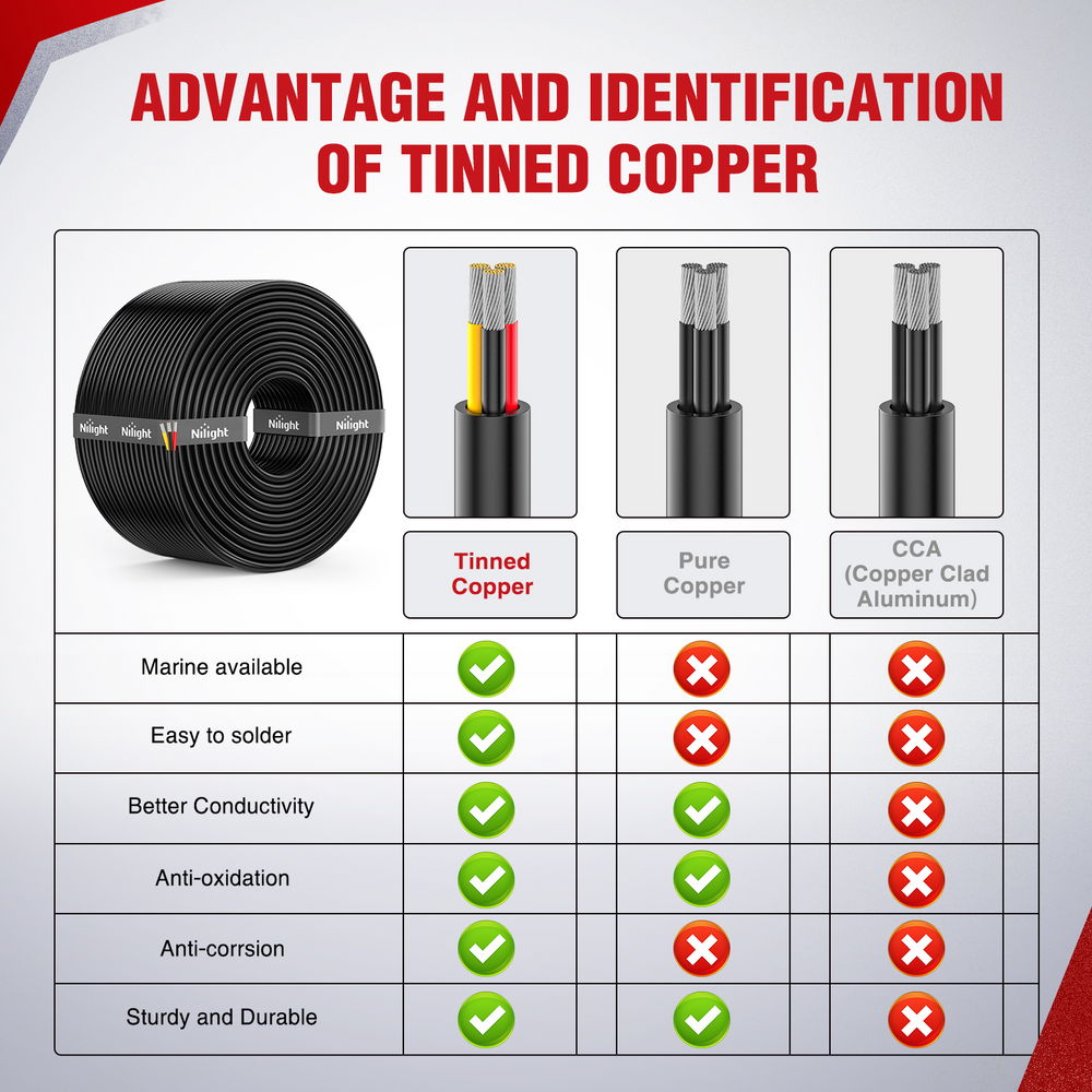 - Highly Conductive: Nilight electrical wire uses high-precision oxygen-free tinned copper. The outside diameter of the Jacket is 2.5 mm, and 21 strands of 0.14 mm tinned copper wire are inside each circuit, has lower resistance and higher conductivity.