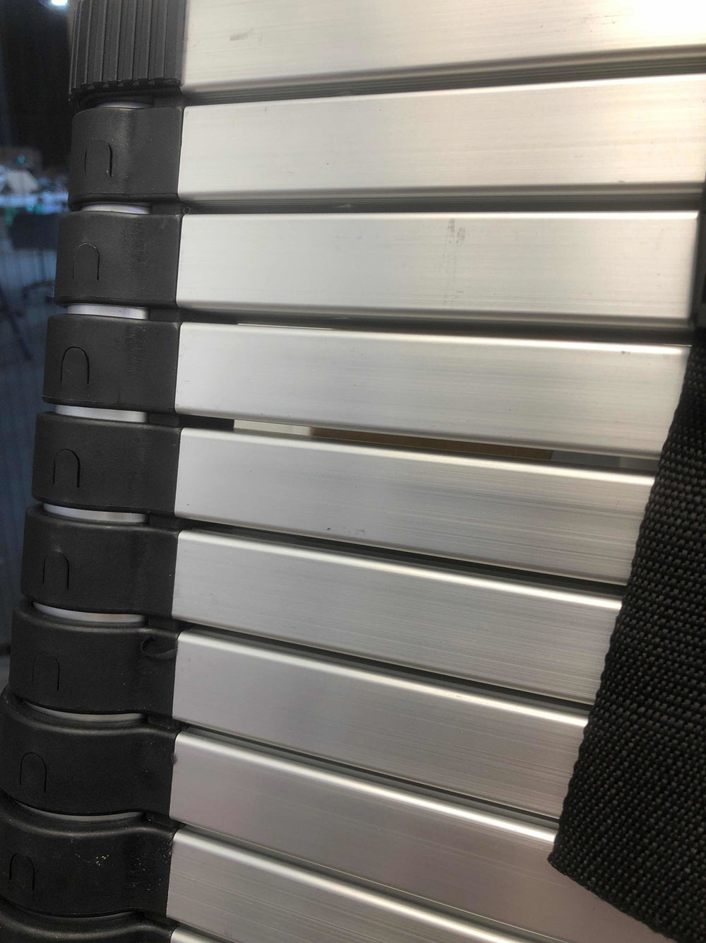 The telescope ladder features a total of 12 steps, with separate locking bottoms on rungs 2 to 11. The independent locks allow user to adjust the height of the ladder to specific requirements such as repairing ceiling lights, hanging picture frames, and painting walls.