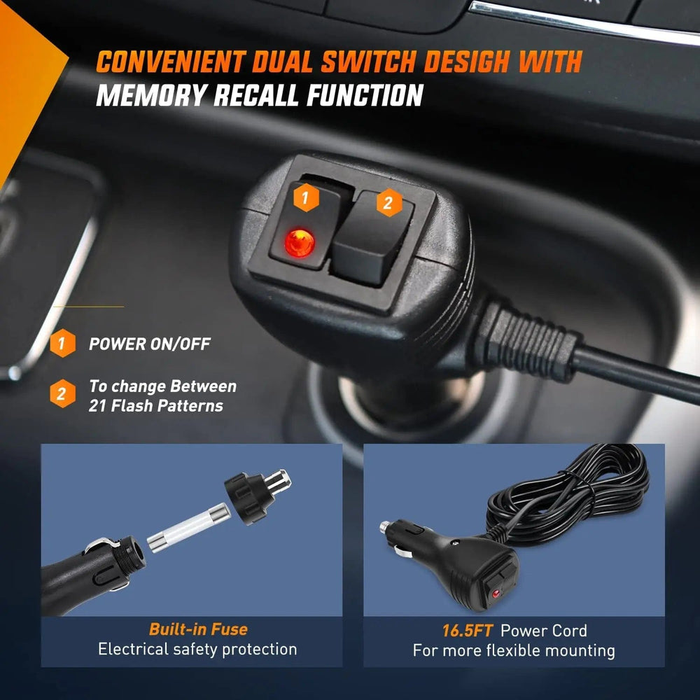 - Cigar Lighter Power Cord: Comes with a 16.5FT heavy-duty power cord from light to cigarette lighter with a 12V cigarette plug. Dual switch design for power on/off and patterns switching, with last pattern recall / memorized function