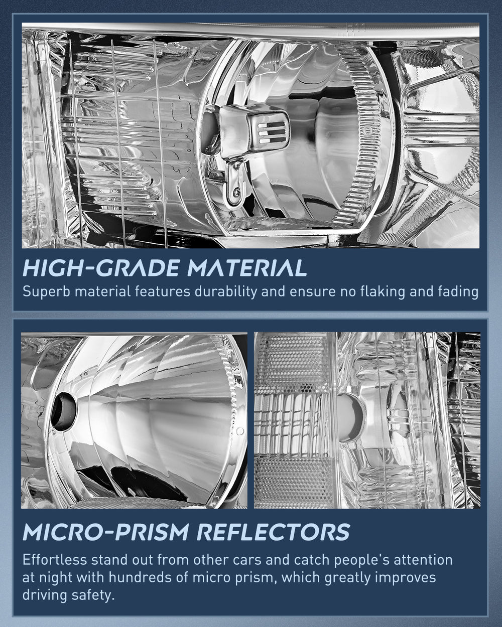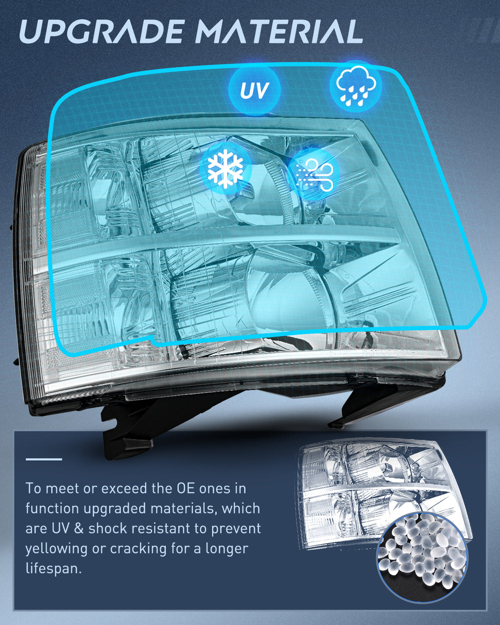 To meet or exceed the OE ones in function upgraded materials, which are UV & shock-resistant to prevent yellowing or cracking for a longer lifespan