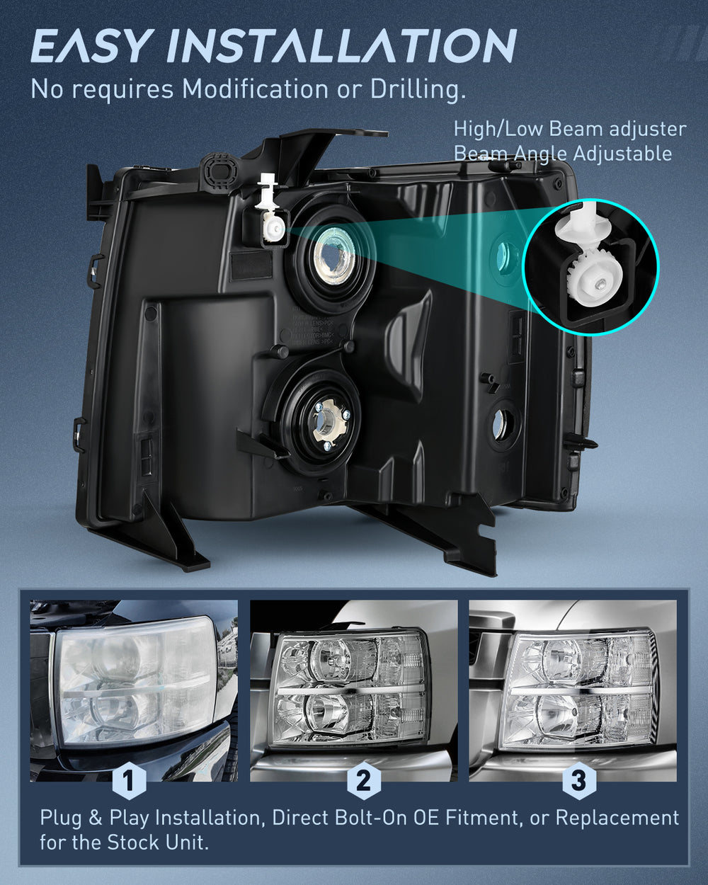 - Simple Installation: Plug-n-play operation, direct OE fitment or replacement for the stock headlight. Requires no modification or drilling.