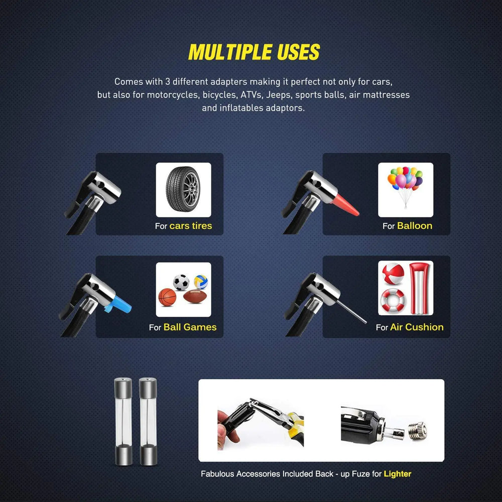 Multiple Uses-- Comes with 3 different adapters making it perfect not only for cars but also for motorcycles, bicycles, ATVs, Jeeps, sports balls, air mattresses, and inflatable adaptors. The 12 feet long power cord is long enough to get to all your tires