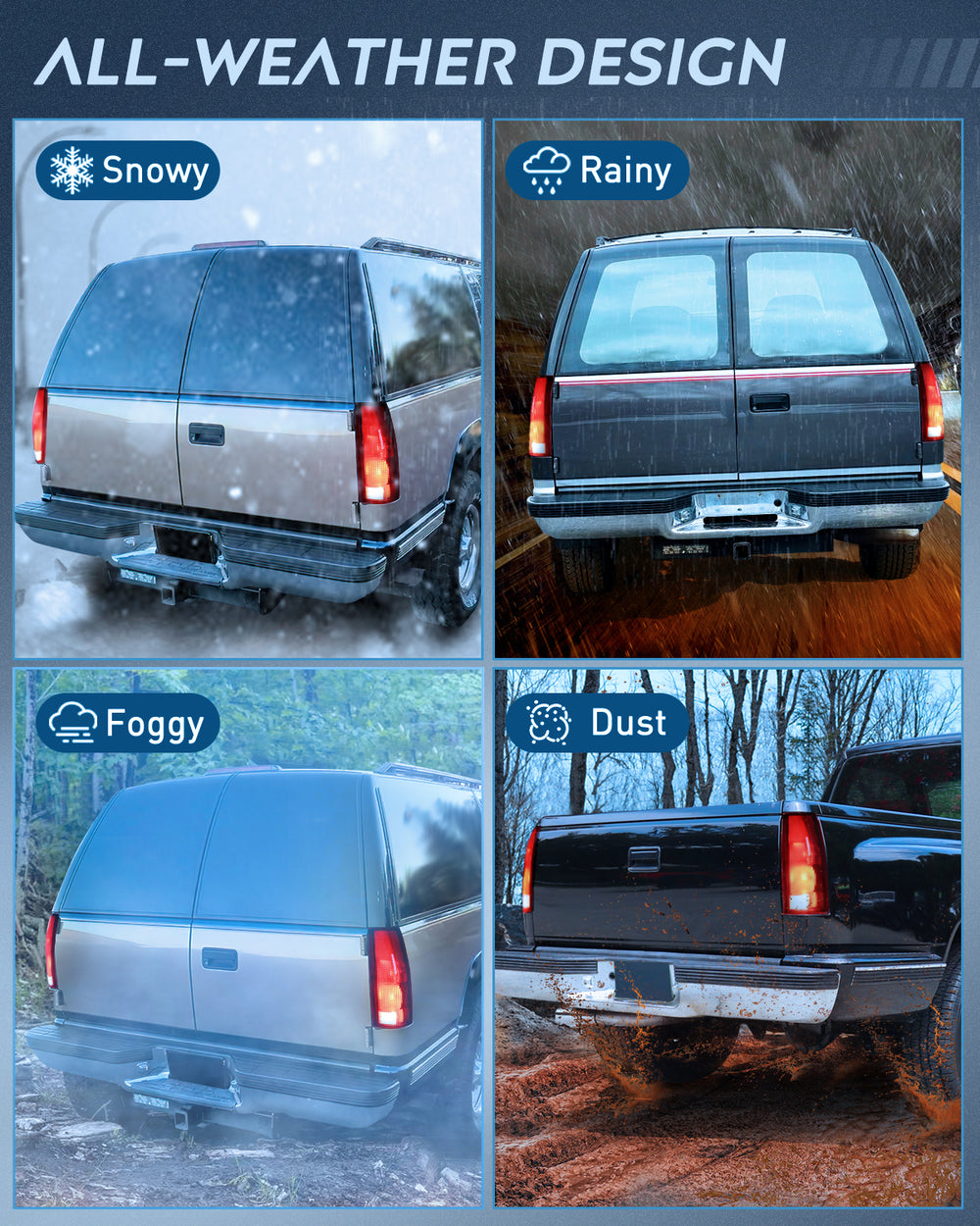 - Premium Quality: The impact resistant shell can withstand impact and vibration. The fully sealed casing can prevent environmental damage, prevent water, snow or heavy rain from seeping in, and ensure that the taillights and third brake lights can work normally in various weather conditions such as rain, snow, fog, sandstorms, etc
