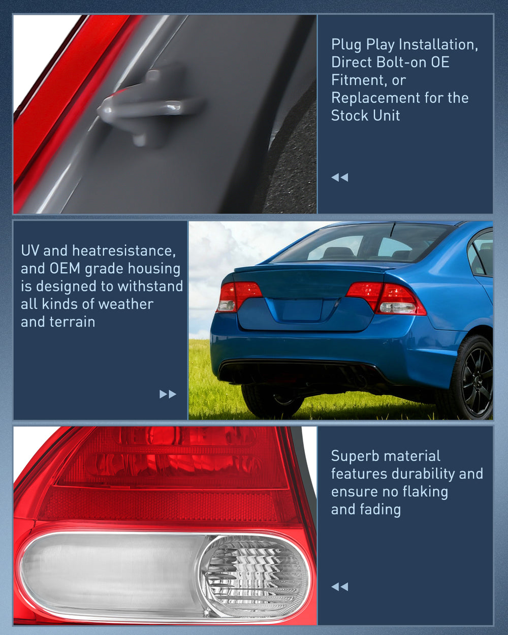 - Compatibility: The taillight assemblies are compatible with 2009 2010 2011 Honda Civic Sedan Hybrid 4 Door. PartsLink Number: HO2818138;HO2819138.OEM Number:33551-SNA-A51;33501-SNA-A51. Please confirm the vehicle fitment before ordering.