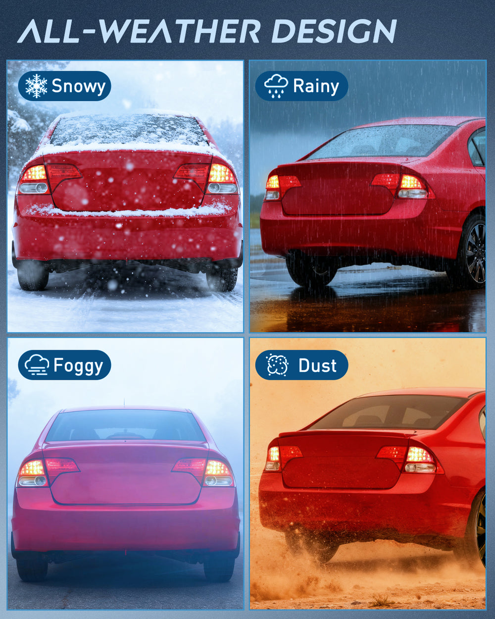 - Durability: The high-impact housing withstands shock and vibration. With fully sealed silicon prevents environmental damages including freezing, foggy, fading, corrosion, and provides reliable service in sorts of weather conditions such as rain, snow, or dust storms, enabling your car looks better and drive safer.