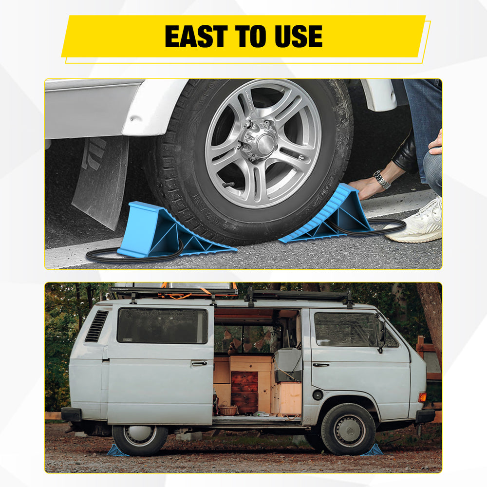 - Convenient Design: Lightweight with pull strap for easy handling and storage. Simply position these wheel chocks before or behind wheels to prevent vehicle movement