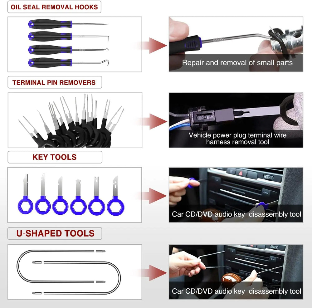 - Package Include: 11PCS Trim Removal Tools, 1PCS Trim Clip Removal Pliers, 1PCS Car Foil Small Scraper Tool, 2PCS upholstery fastener remover, 4 PCS precision hook pick, 8 PCS stainless steel stereo removal tools, 11PCS stainless steel Auto Terminal Removal Key Tool, 1PCS wiring threader, 1PCS tightening device and a portable storage bag
