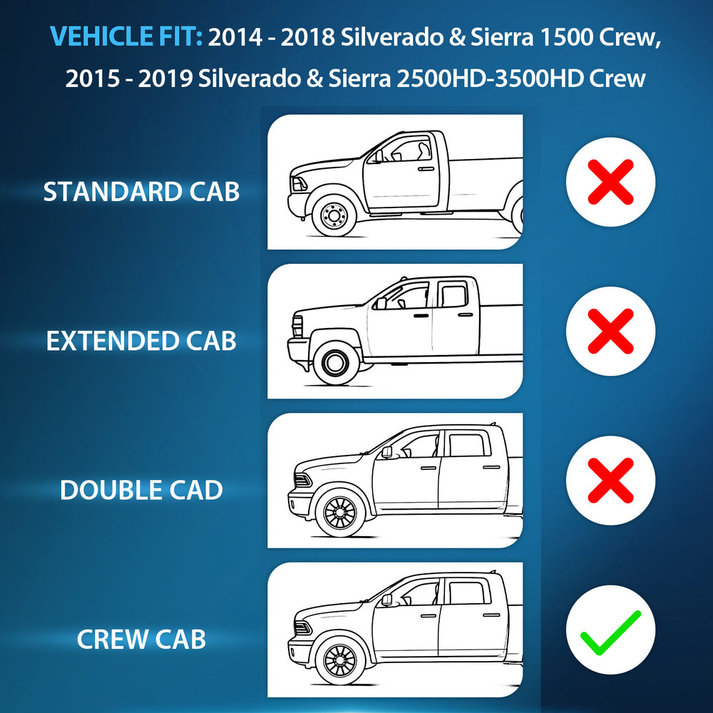- Fitment: Compatible with Chevy Silverado 1500 2019-2024 Crew Cab, GMC Sierra 1500 2019-2024 Crew Cab