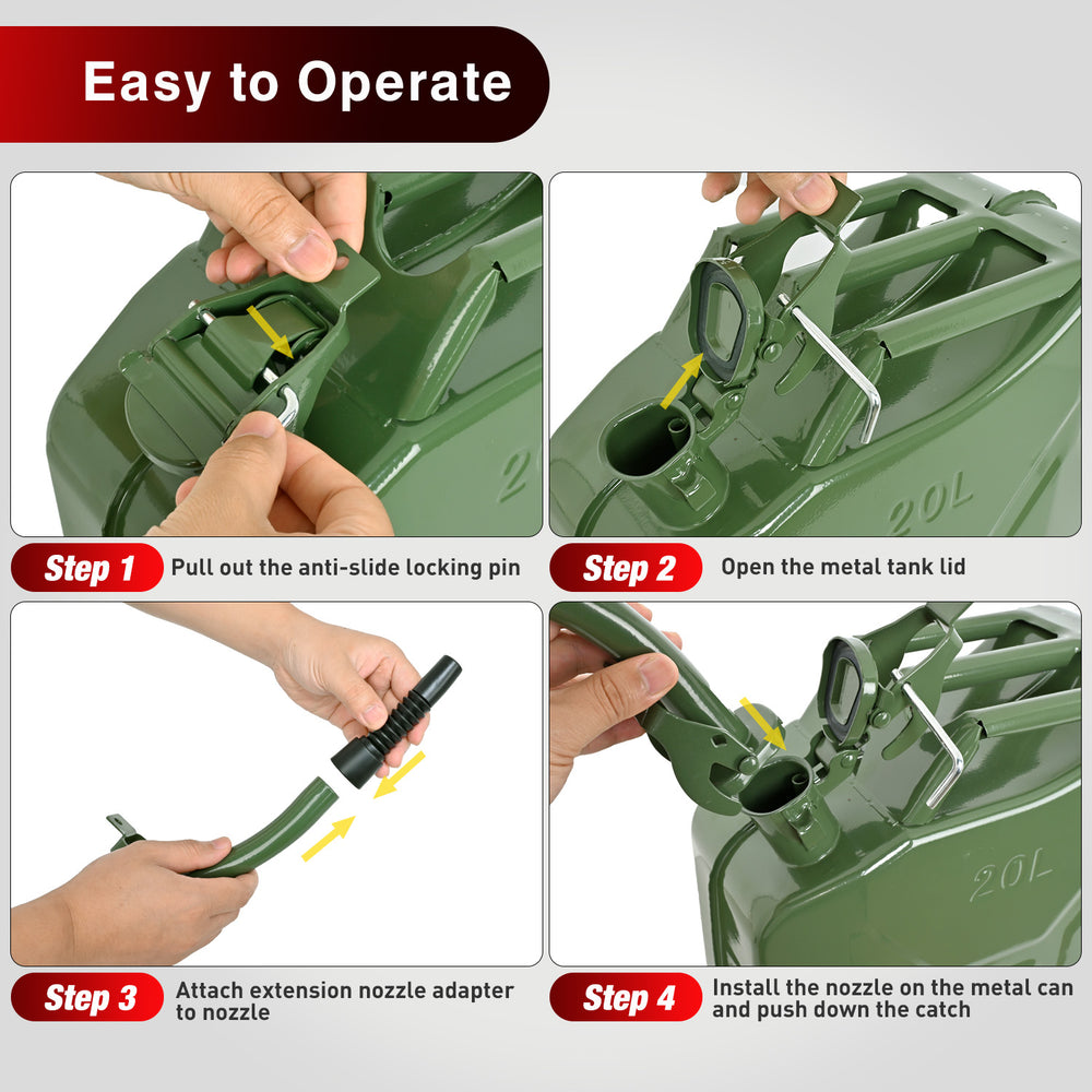 • Leak-Proof Non-Slip:  5 gallon gas can is equipped with a metal pouring can spout and flexible rubber extention, which makes it easy to pour out the gasoline without spilling, and the non-slip safety lock pin can effectively prevent gasoline leakage when the tank tipps over during transportation