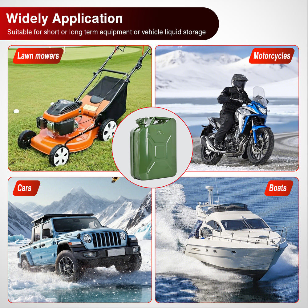 • 5 Gallon Gas Can:  Green metal gas cans hold up to 5 gallons (20 liters) of fuel gasoline and is designed for short-term or long-term storage of fuel, ensuring your lawn mowers, trimmers, ATVs, snow blowers and other automotive vehicles outdoor power equipment are always full and ready for optimal performance