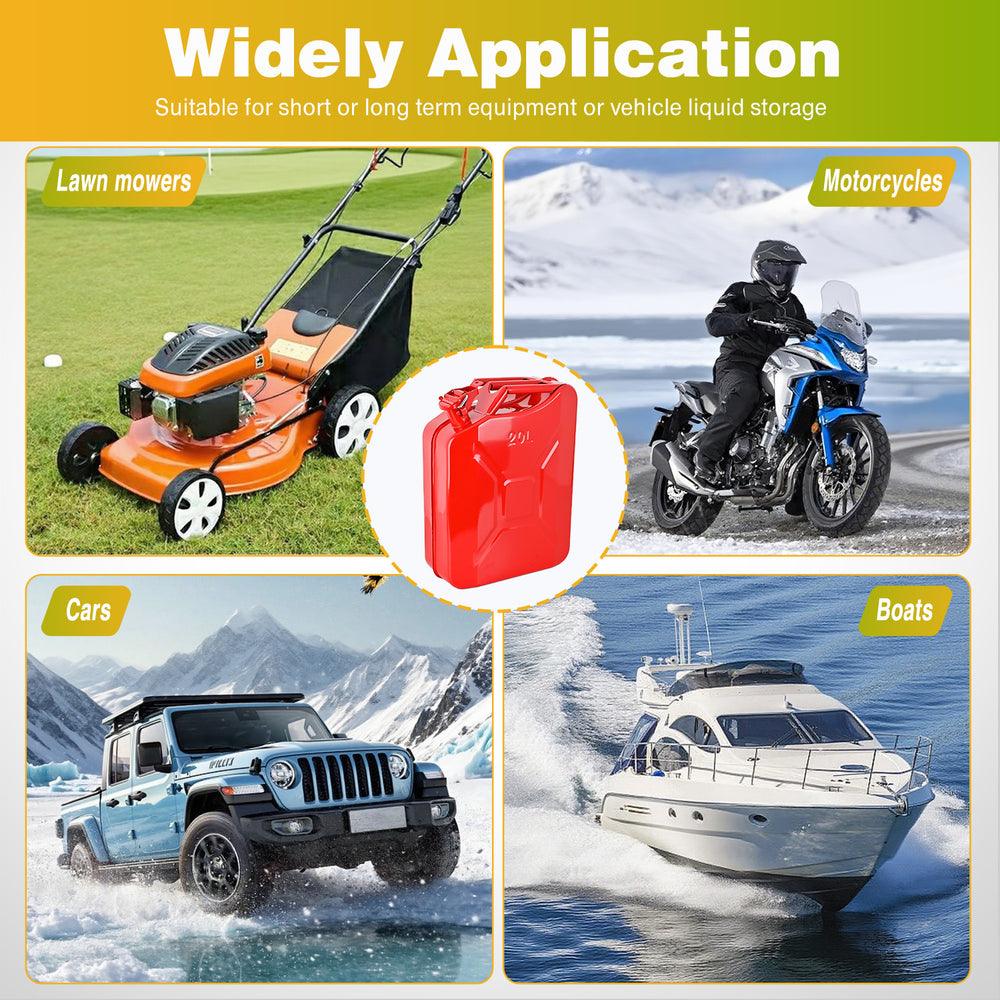 - 5 Gallon Gas Can: Red metal gas cans hold up to 5 gallons (20 liters) of fuel gasoline and is designed for short-term or long-term storage of fuel, ensuring your lawn mowers, trimmers, ATVs, snow blowers and other automotive vehicles outdoor power equipment are always full and ready for optimal performance