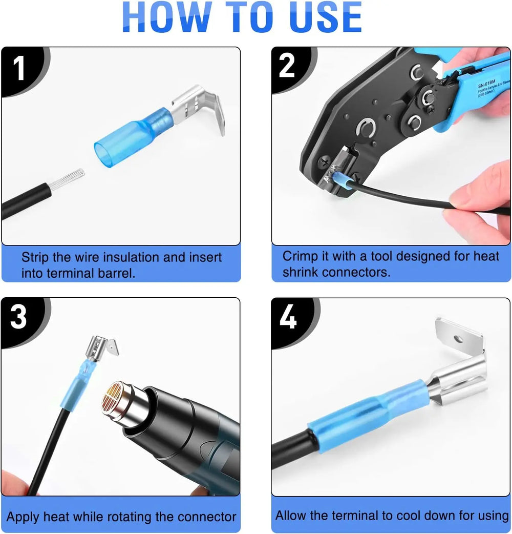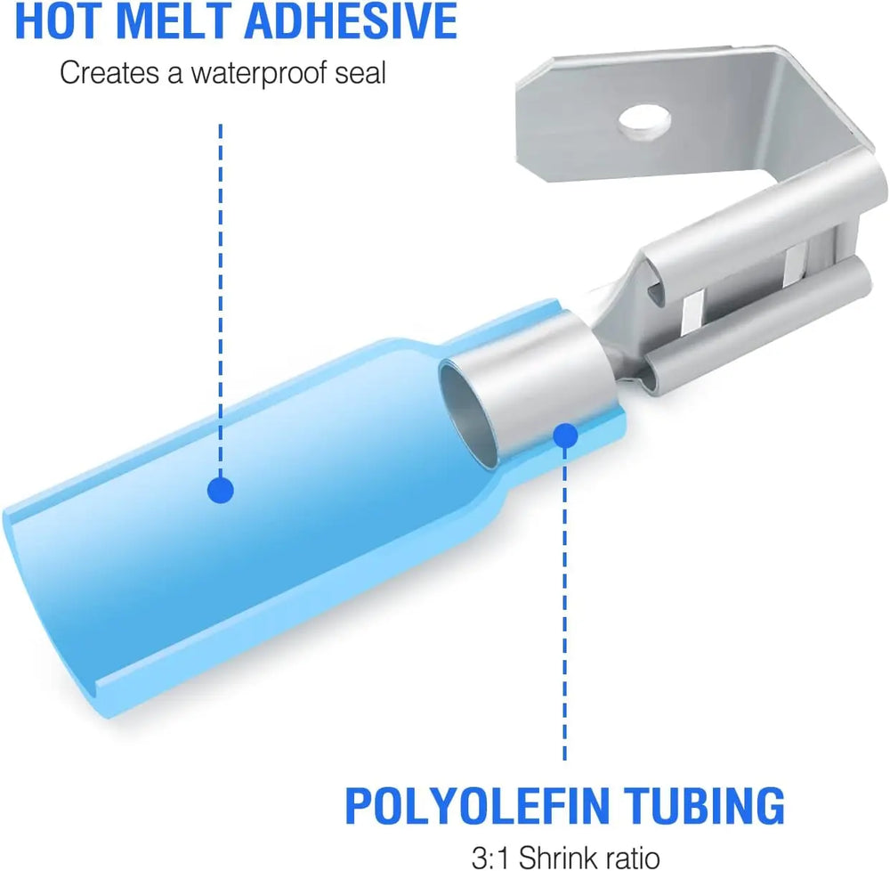 - High Quality Terminals: High-quality insulated crimp terminal connector. Scale down to 1/3 of the original size. Heat activated adhesive seals the connection to the element. Your wires won't slip out.