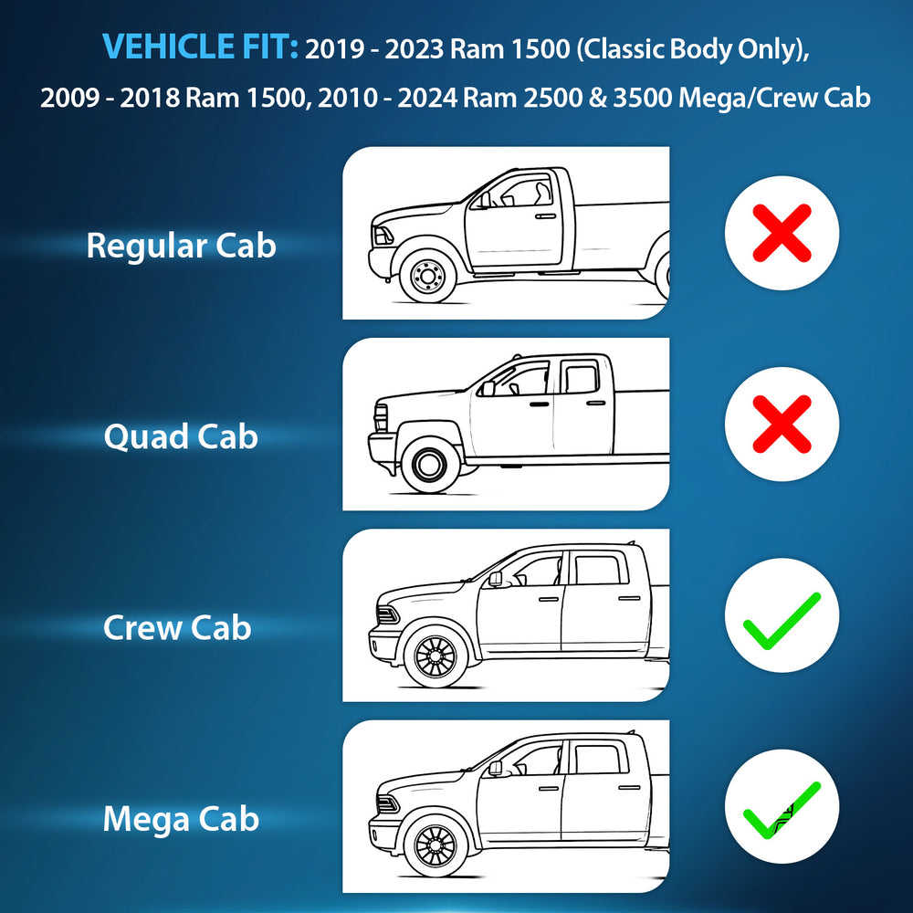 Fitment: Compatible with 2009 - 2018 Ram 1500, 2010 - 2024 Ram 2500 & 3500 Mega/Crew Cab, 2019 - 2023 Ram 1500 (Classic Body Only)