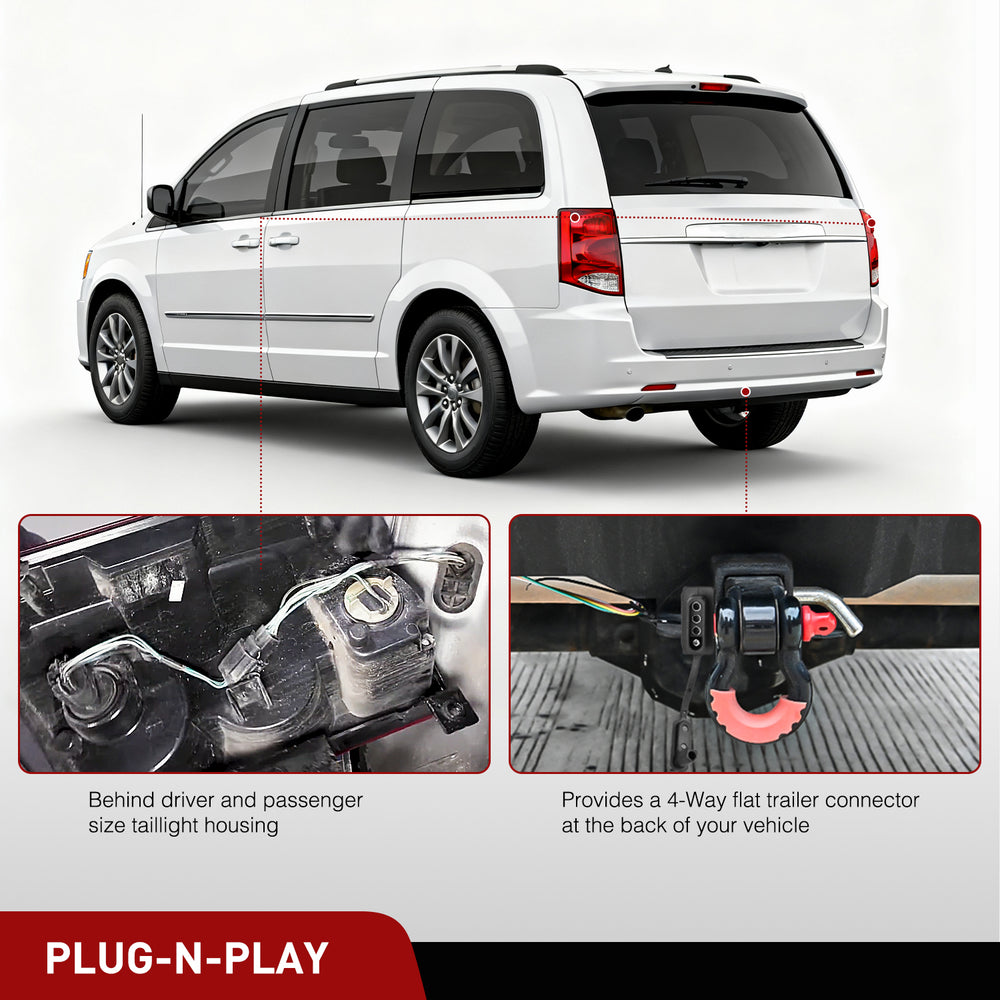 - Dust Cover: To promote long-lasting use and weather resistance, this 4-pole trailer lighting wire harness for 2011-2020 Dodge Grand Caravan; 2011-2016 Chrysler Town and Country; 2012- 2015 Ram C/V. Comes with a tight-fitting rubber dust cover. It easily fits onto the 4-way flat connector when not in use, protecting it against the outdoor elements.