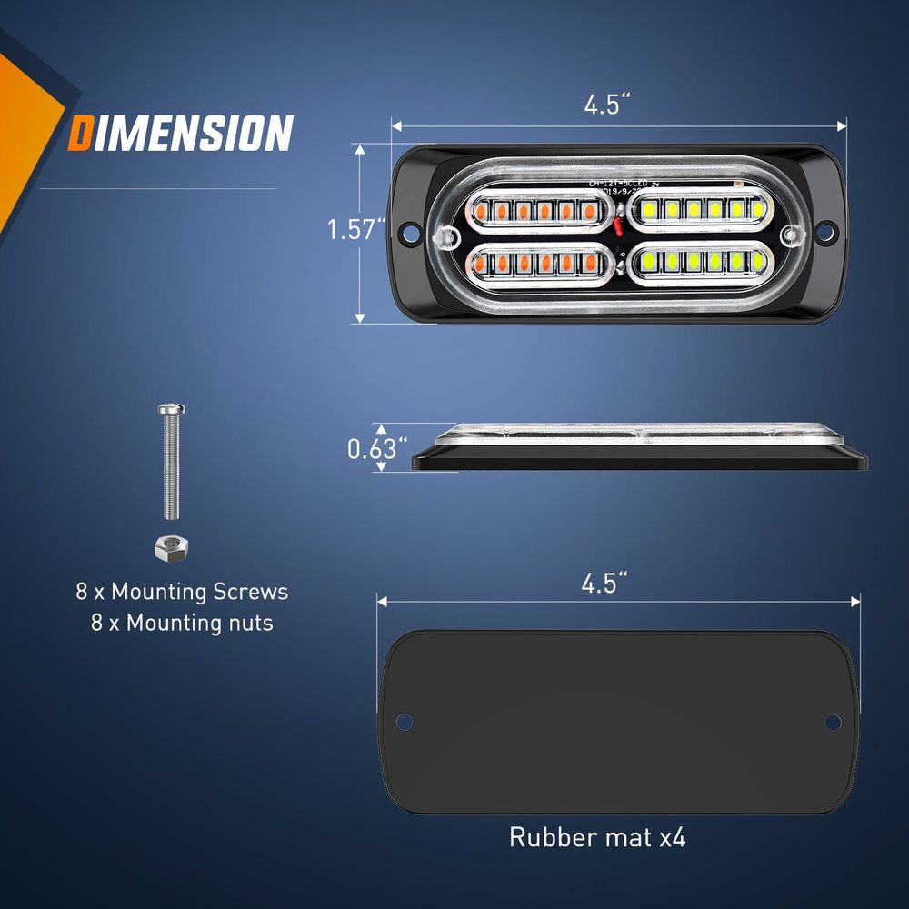 Applications: This strobe light is suitable for any 12-24V vehicle such as trucks, construction vehicles, tractors, snowplows, SUVs, Campers, Trailers etc. It can be mounted on any surface of the car such as the sides, grille in front of the vehicle, and rear of the car. package includes: 4pcs LED Strobe Lights, 4pcs Rubber Mats, 8x Mounting Screws.