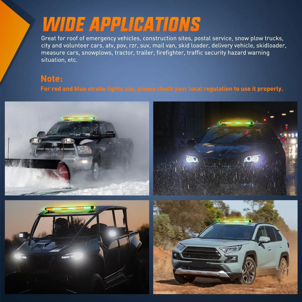 Compatible with any 12-24V DC vehicle. Great for the roof of construction vehicles, mail vans, snowplows trucks, skid loaders, tractors, trailers, delivery vehicles, measure cars, ATV, POV, RZR, etc.