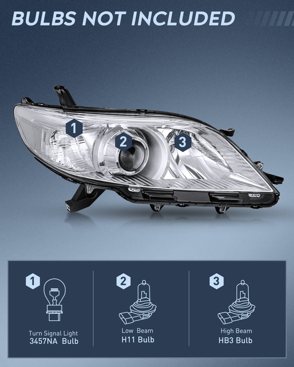 - Compatibility: The headlights assemblies are compatible with 2011-2020 TOYOTA SIENNA. Bulbs Type: High Beam: 9005 bulb; Low Beam: p1; Turn Signal Light: 3457NA bulb. Note: Bulbs are not include