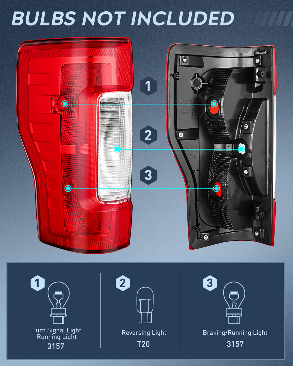 - Compatibility: The taillight assemblies are compatible with 2017 2018 2019 Ford F250 F350 Super Duty Incandescent Tail Light w/o Blind Spot Monitor Model. Please confirm the vehicle fitment before ordering.