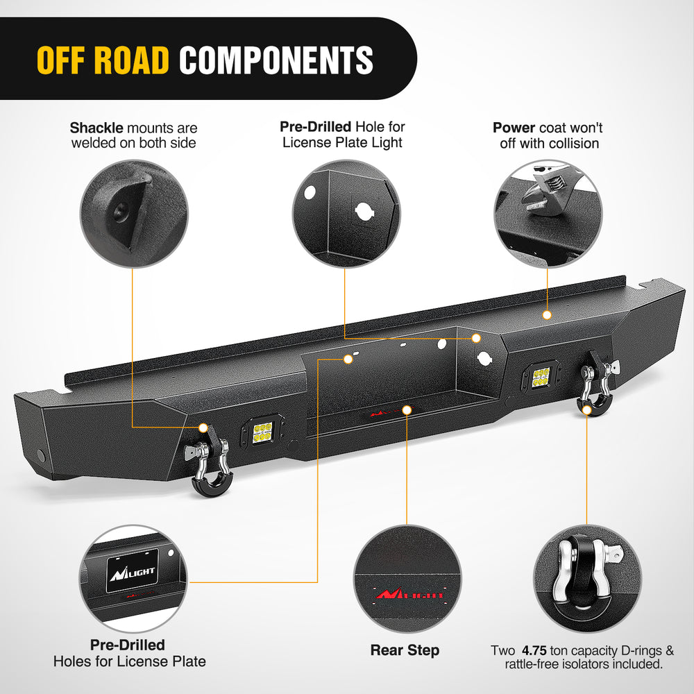 - Bolt-On Installation: This Nilight Rear Bumper installs easily. No modifications are required to complete the basic installation process, however, some mechanical experience is helpful