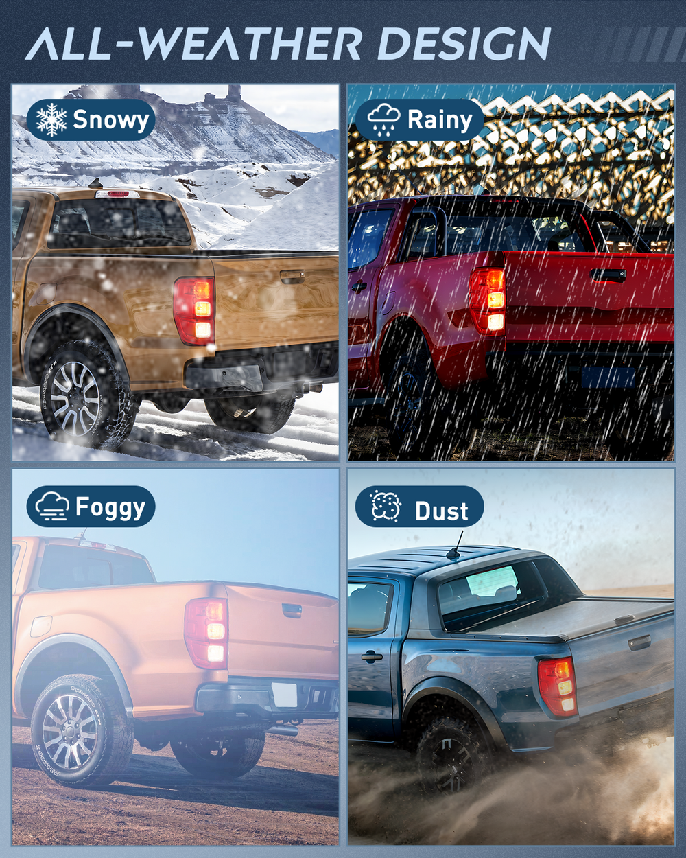 - Durability: The high-impact housing withstands shock and vibration. With fully sealed silicon prevents environmental damages including freezing, foggy, fading, corrosion, and provides reliable service in sorts of weather conditions such as rain, snow, or dust storms, enabling your car looks better and drive safer.