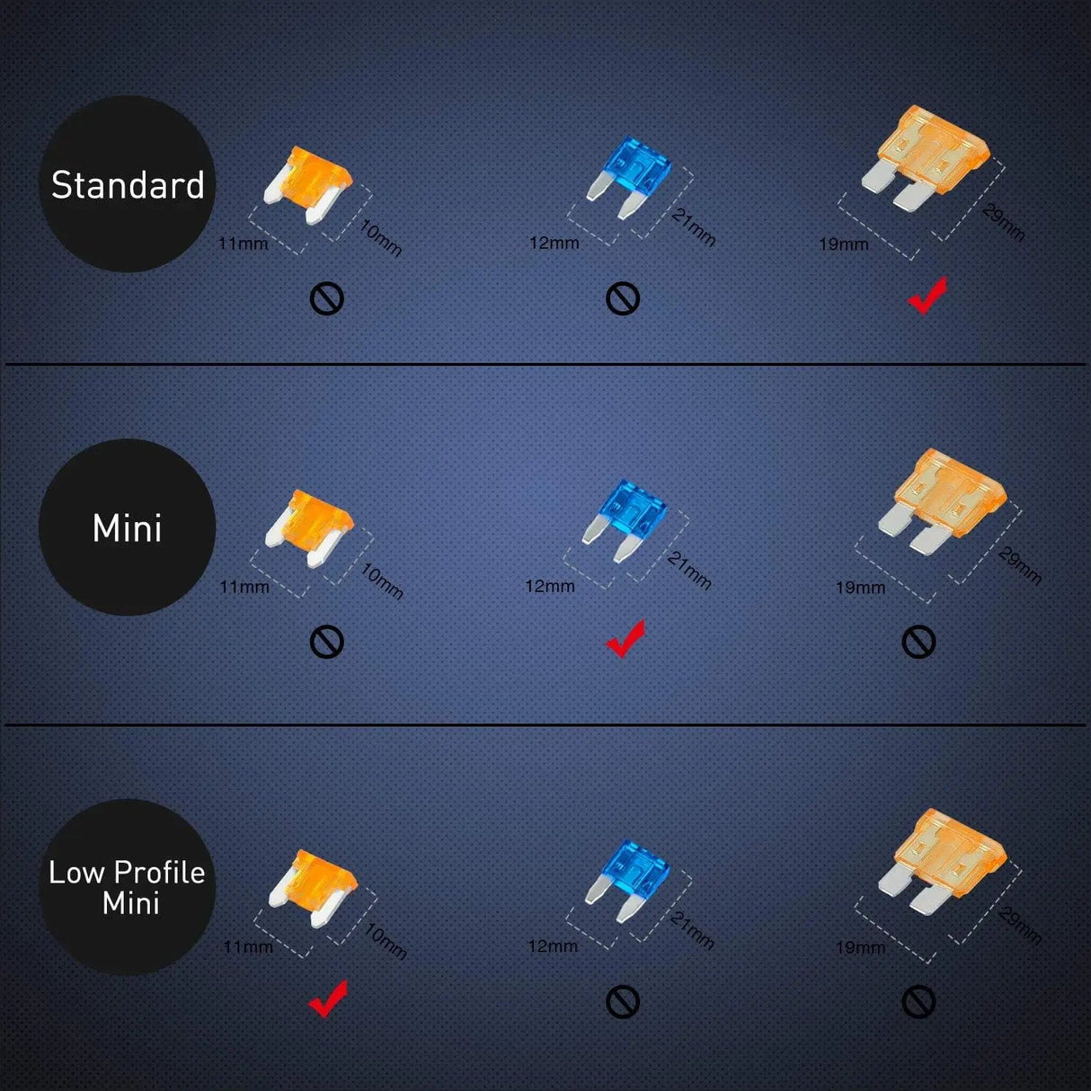 - Wide Compatibility: 3pcs low profile mini fuses adapter with 5 Amp low profile mini blade fuse fits for Korean Cars; 4pcs mini fuse adapter with 15 Amp mini blade fuse fits for Japan and US Cars; 3pcs standard fuse adapter with 5 Amp standard blade fuse fits for European Cars