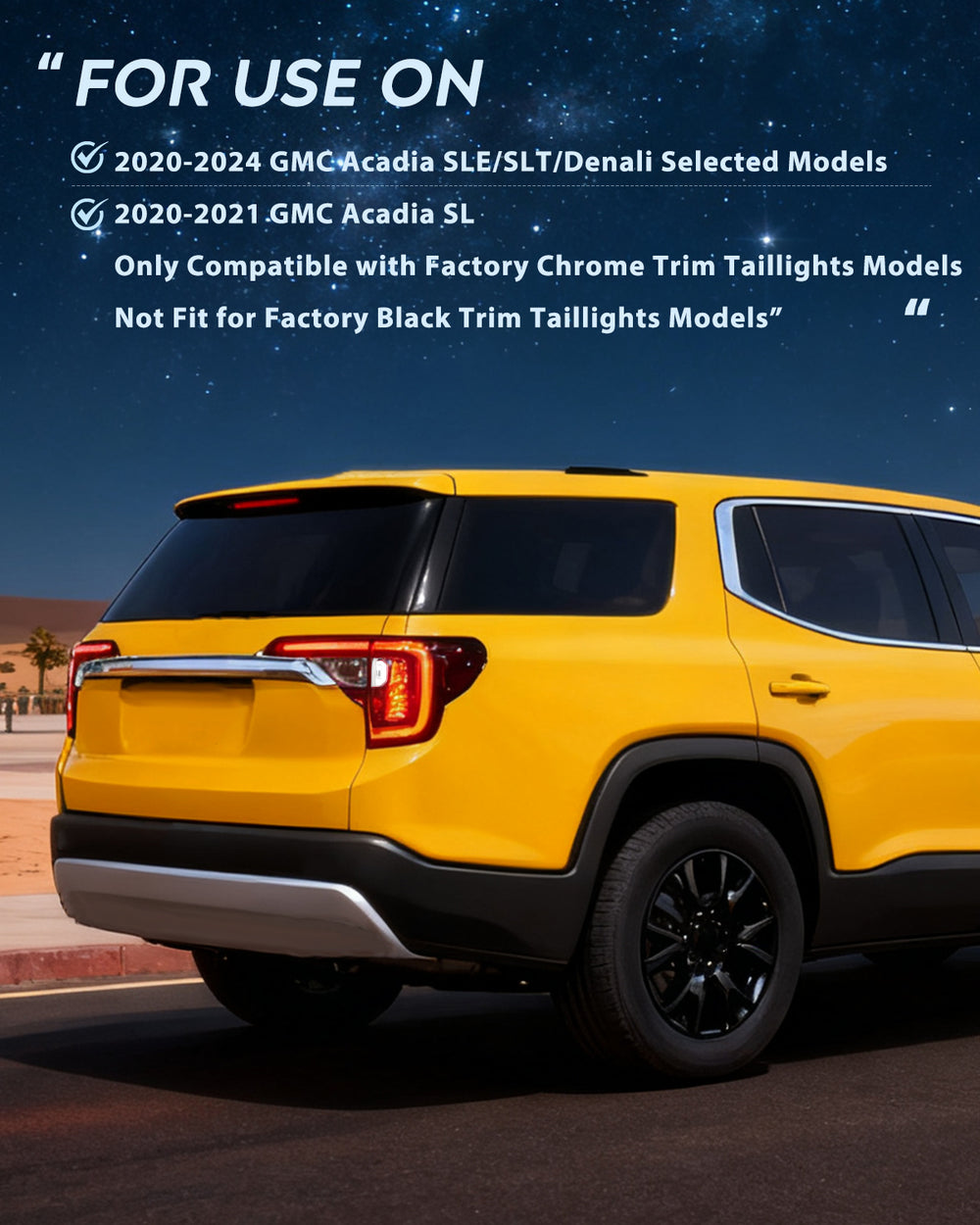 - Compatibility: The taillight assemblies are compatible with 2020-2023 GMC Acadia SLE/SLT/Denali Selected Models, 2020-2021 GMC Acadia SL. Only Compatible with Factory Chrome Trim Taillights Models. Not Fit for Factory Black Trim Taillights Models. For oem:84863045,GM2801316. Please confirm the vehicle fitment before ordering.