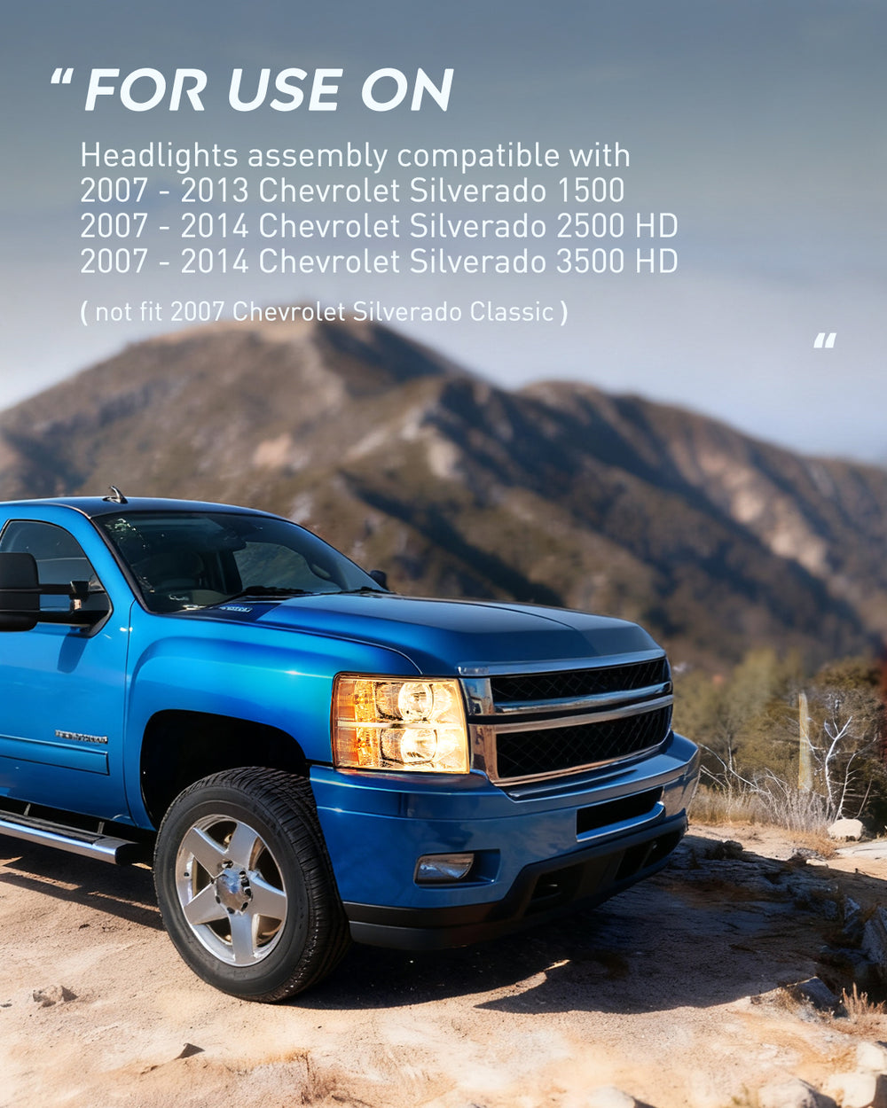 • Compatibility: The headlights assemblies are compatible with 2007-2013 Chevy Silverado 1500 and 2007-2014 Chevy Silverado 2500HD 3500HD. High beam bulb type: 9005; low beam bulb type: p1. Sockets are included. Bulbs are NOT included, please apply the original one.