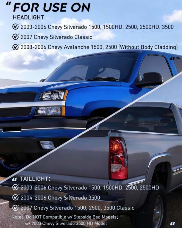 - Compatibility: The headlight and taillight assemblies are compatible with 2003-2006 Chevy Silverado 1500, 1500HD, 2500, 2500HD;2004-2006 Chevy Silverado 3500; 2007 Chevy Silverado 1500, 2500, 3500 Classic; Do not fit Barn Door or Stepside models Only Fits Fleetside Models.Please confirm the vehicle fitment before ordering.