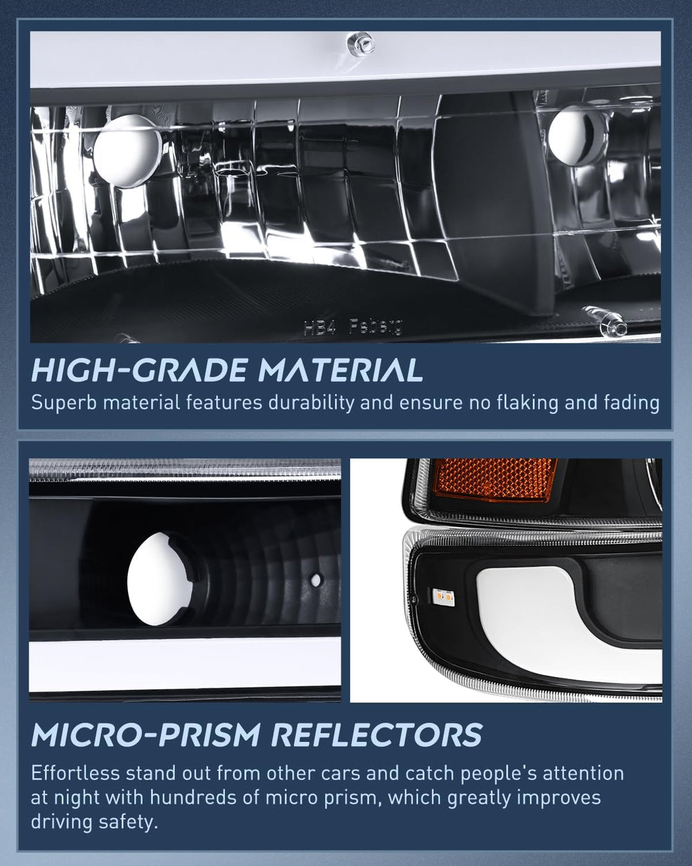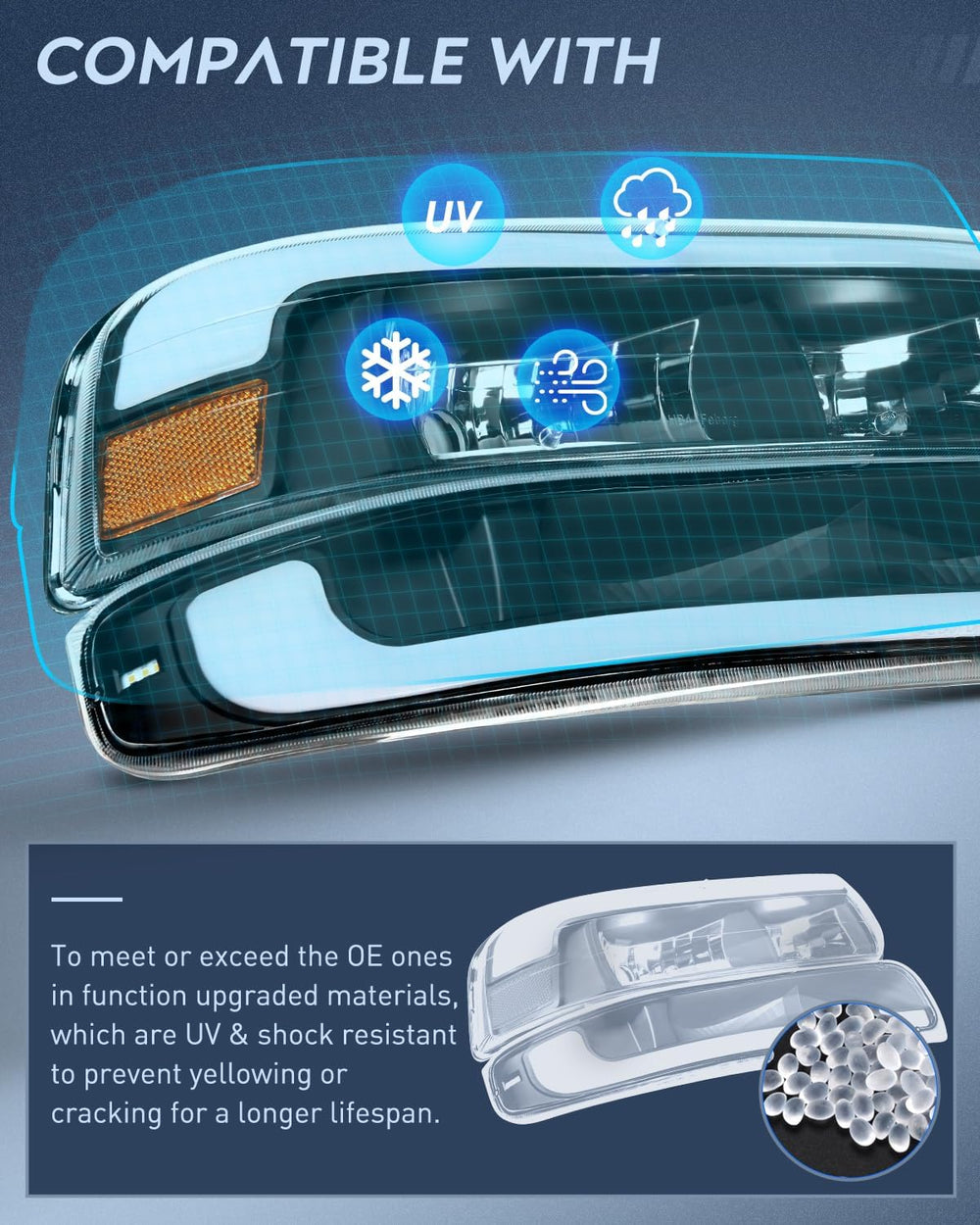 LED DRL Headlight Assembly for 1999 2000 2001 2002 Chevy Silverado 1500 1500HD 2500 2500HD 3500 Chevrolet Tahoe Suburban Replacement Headlamp Clean Lens Black Housing Amber Bumper Lights Set