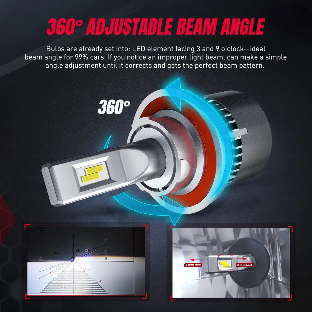- Perfect Beam Pattern: Features 3mm (less than 1/8 inch )ultra slim design, placing the LEDs closest together and set into facing 3 and 9 o’clock to produce the closest perfect beam-type as a halogen lamp, without any dark spot but a clear cut off a pattern that does not blind oncoming drivers. If an improper light beam is found on your vehicle can 360°adjust the beam angle until it corrects to the best one.