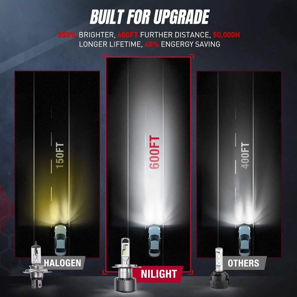 - 350% Brighter Light: Utilize 70W 8000-10000LM quality led chips that output 350% brighter light than factory halogen lights and get an irradiation coverage broader and further. Greater visibility, and safer driving lights.