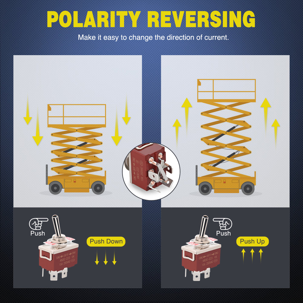• Widely Used: This polarity reversing switch replacement for most RVs, trailers, car, ATVs, UTVs boats etc. The switch is designed with jumper bars for polarity reversing, connecting power and ground, and two DC motor leads and the switch will reverse the motor direction.