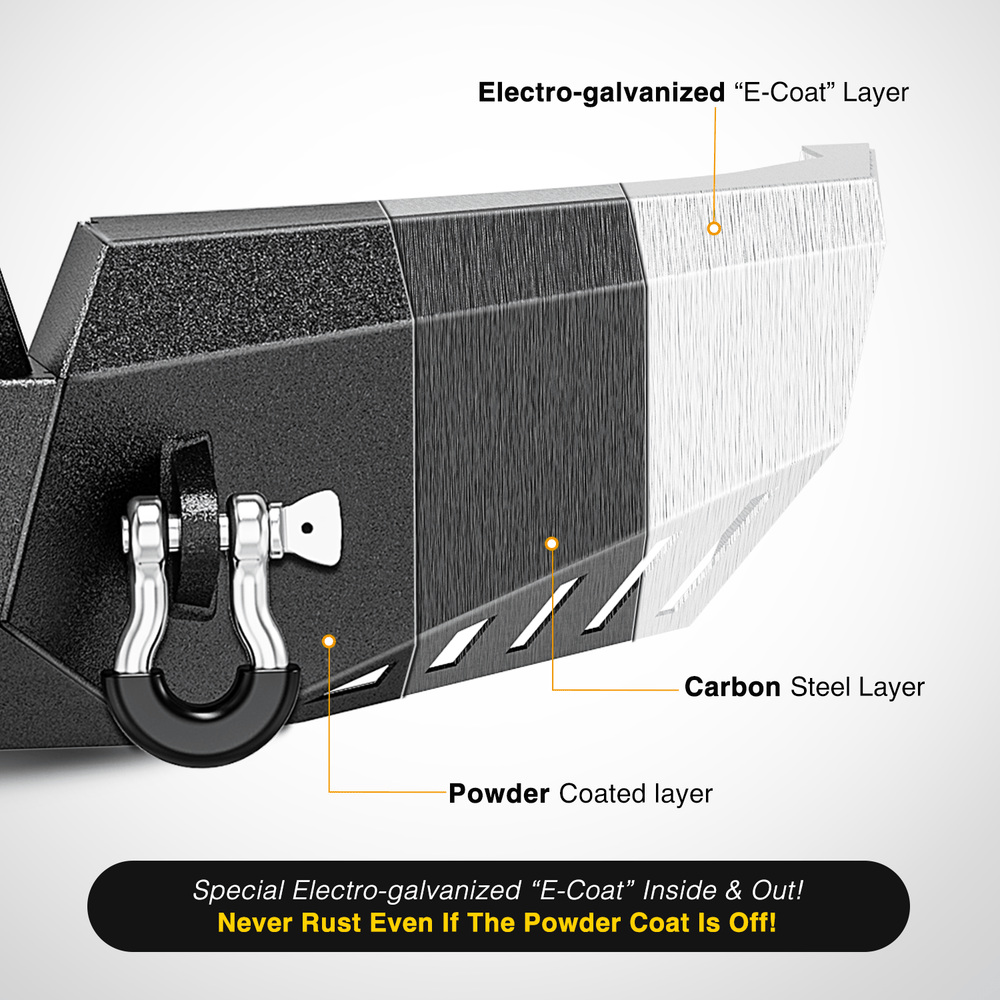 Premium E-coating process and textured black powder coat finish make the wear resistance and corrosion resistance of the rear bumper better, Give your car a tougher look & 360°Protection.