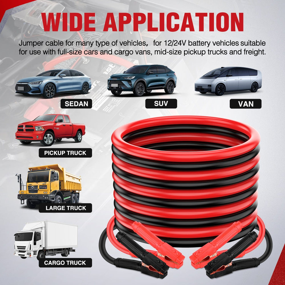 - Heavy Duty Jumper Cable: Adopts 1 GA 30 FT high-quality CCA red and black cable,premium PVC sheath, with good electrical conductivity, durable, heavy-duty and other characteristics. The booster cables used to jump start dead or weak batteries, are powerful helper in emergencies,perfect for full-size cars and vans, pickup trucks, mid-size cars,and small/compact cars