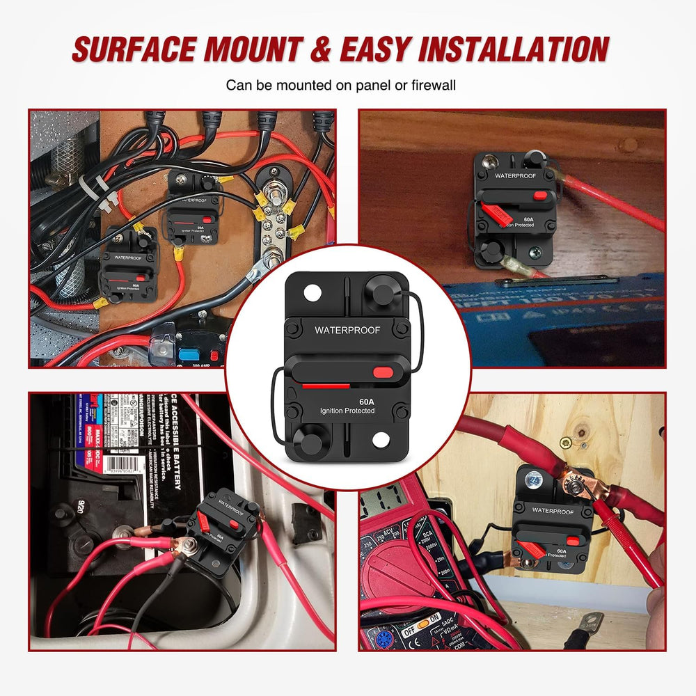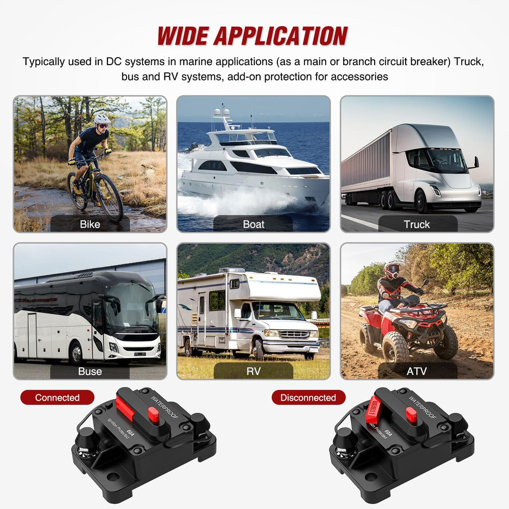- Application: Mainly used on car audio and video systems, boat, truck, bus, RV, ATV, marine, etc, and DC sound amplifier system overload protection. The waterproof circuit breaker is surface Mount, mount on panel or firewall.The unique push button reset can also be used as a kill switch.