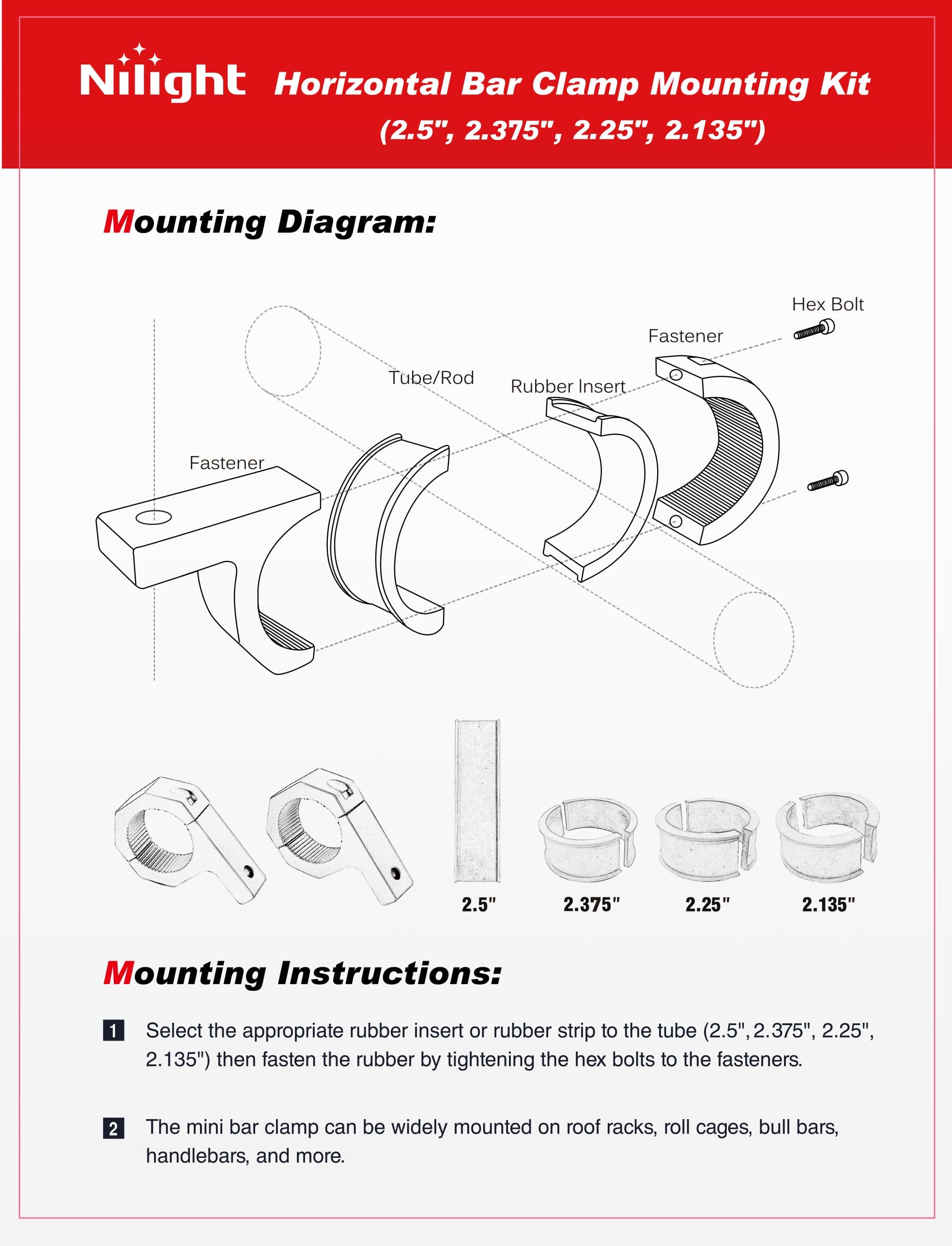 The bar clamp is designed for smaller horizontal tube sizes: 2.135 inches, 2.25 inches, 2.375 inches, and 2.5 inches. Convenient and simply the installation
